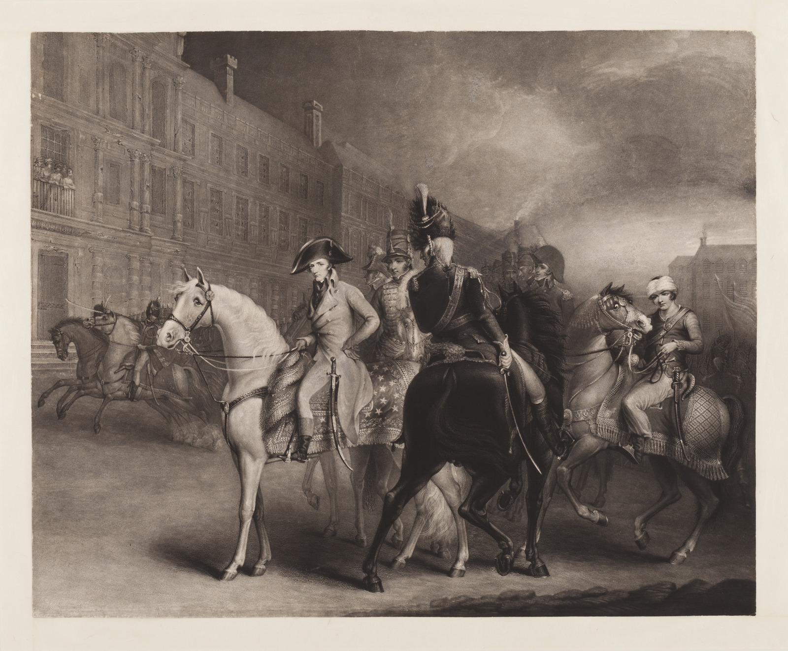 Militairen en een vrouw voor een gebouw in de Napole...