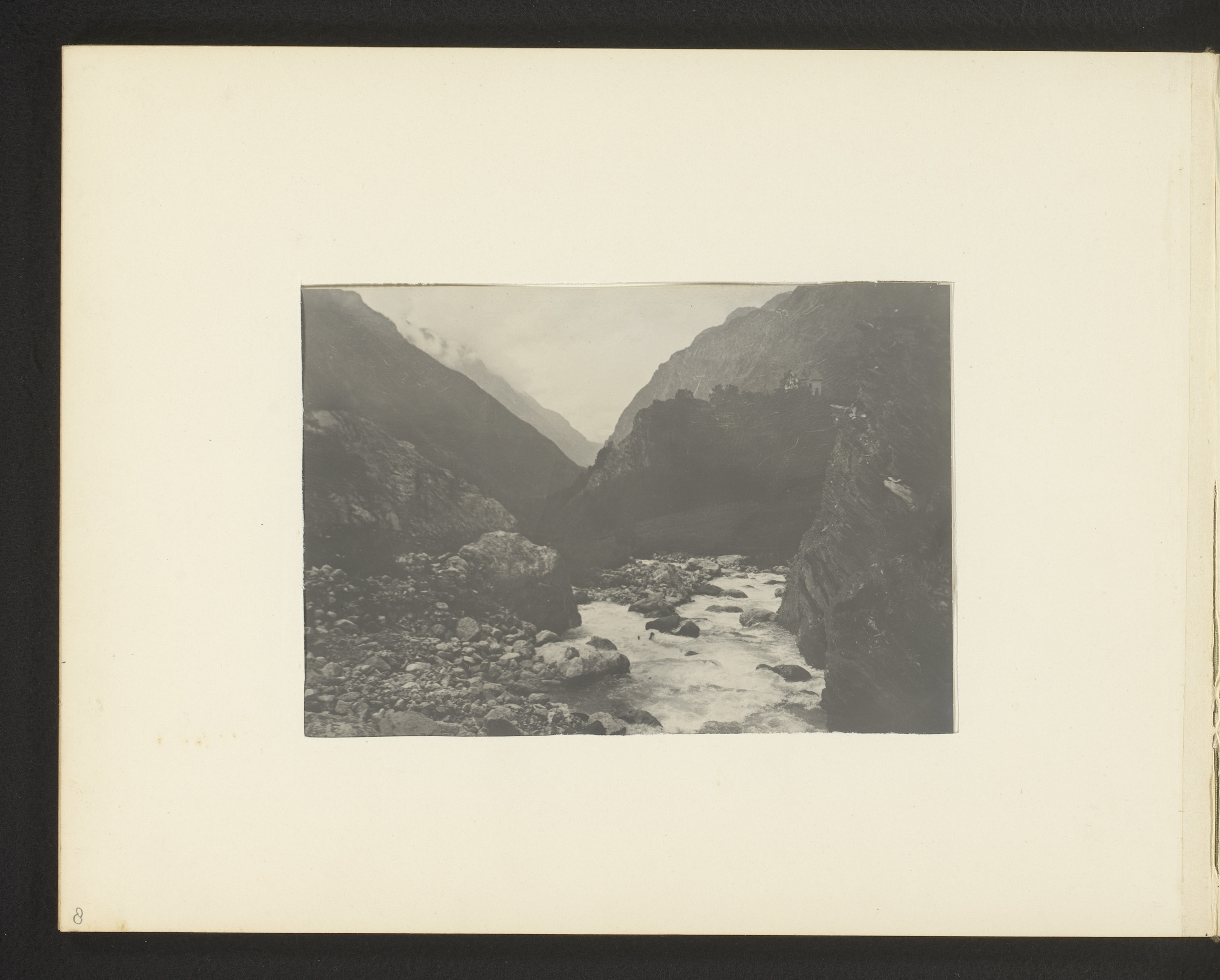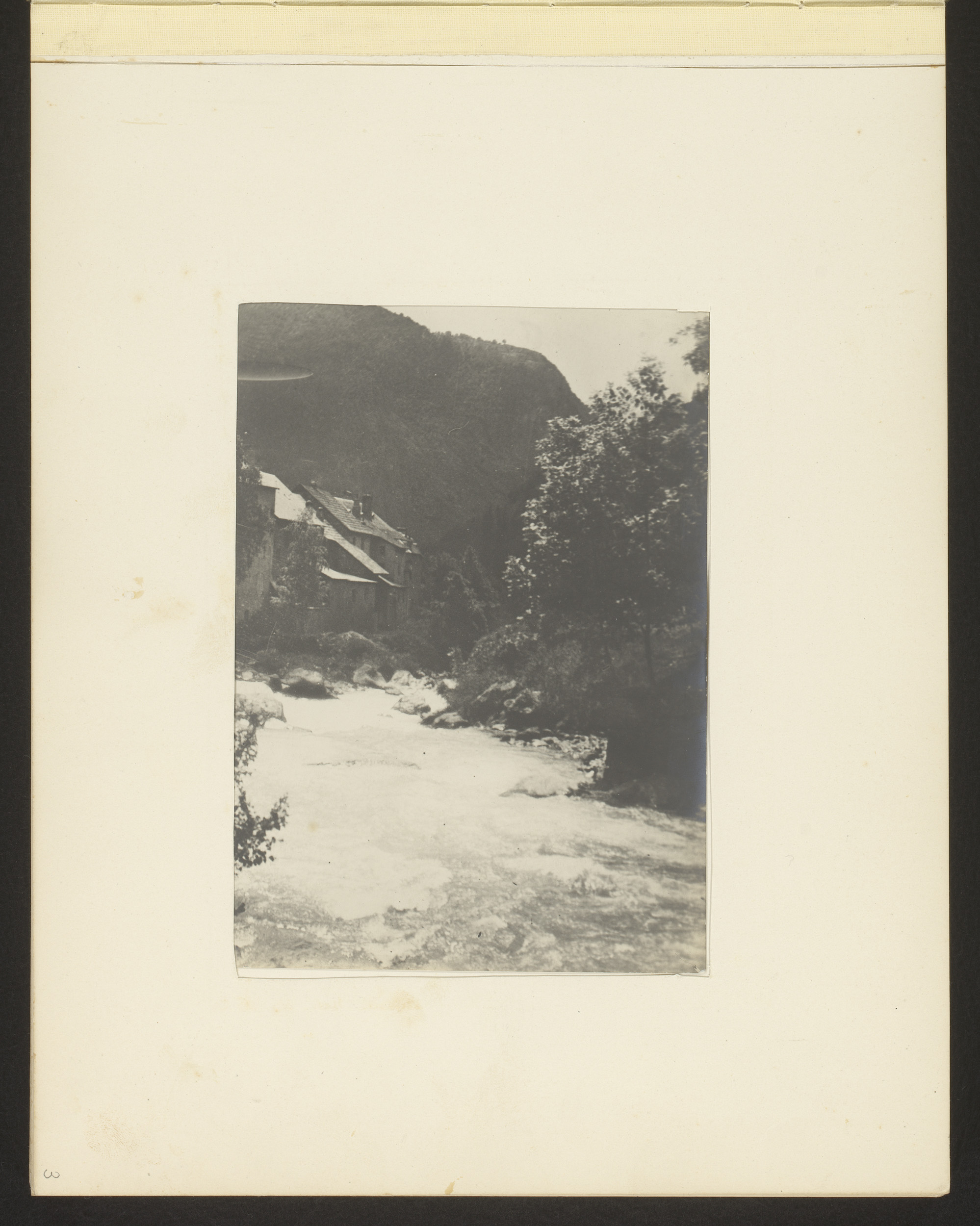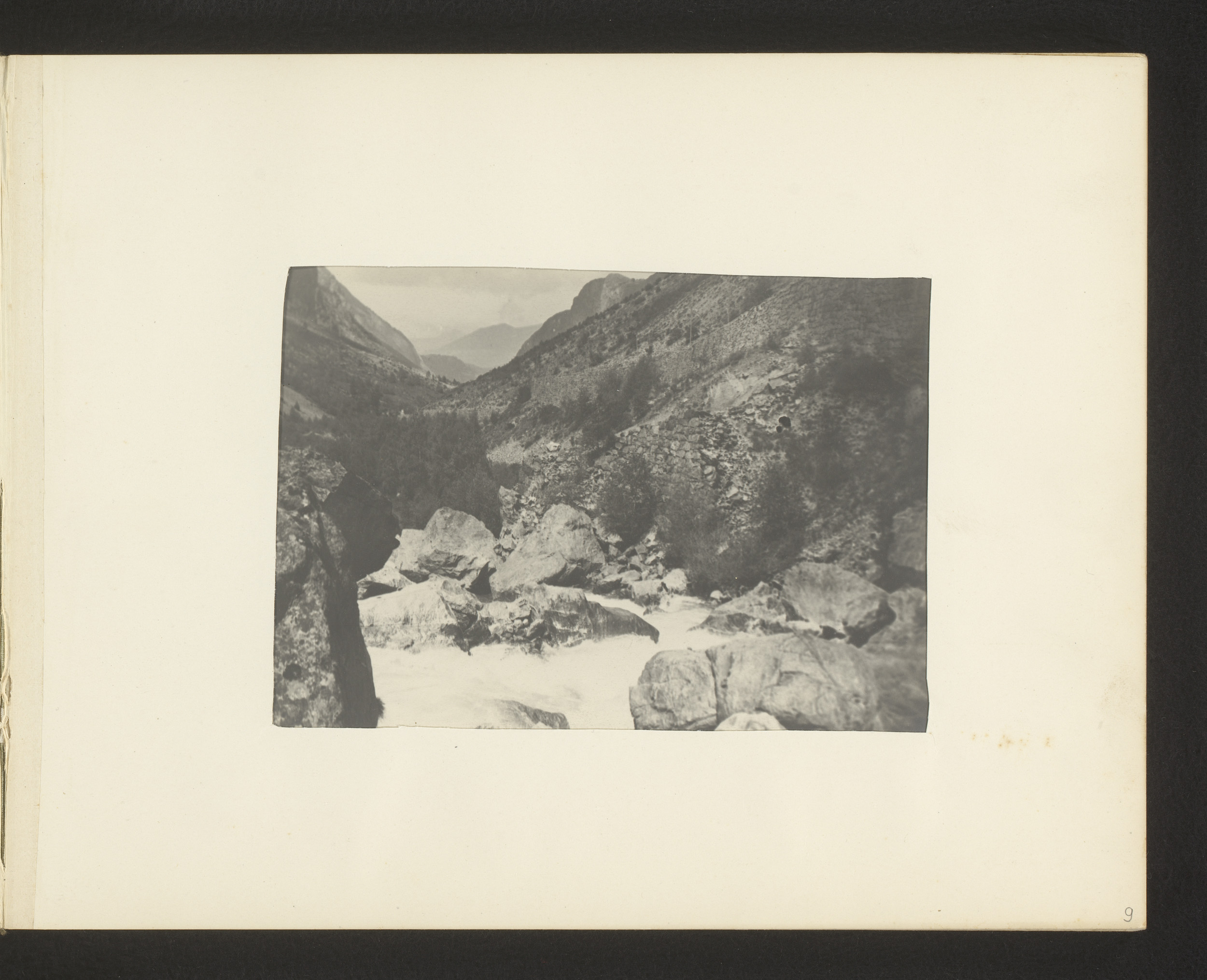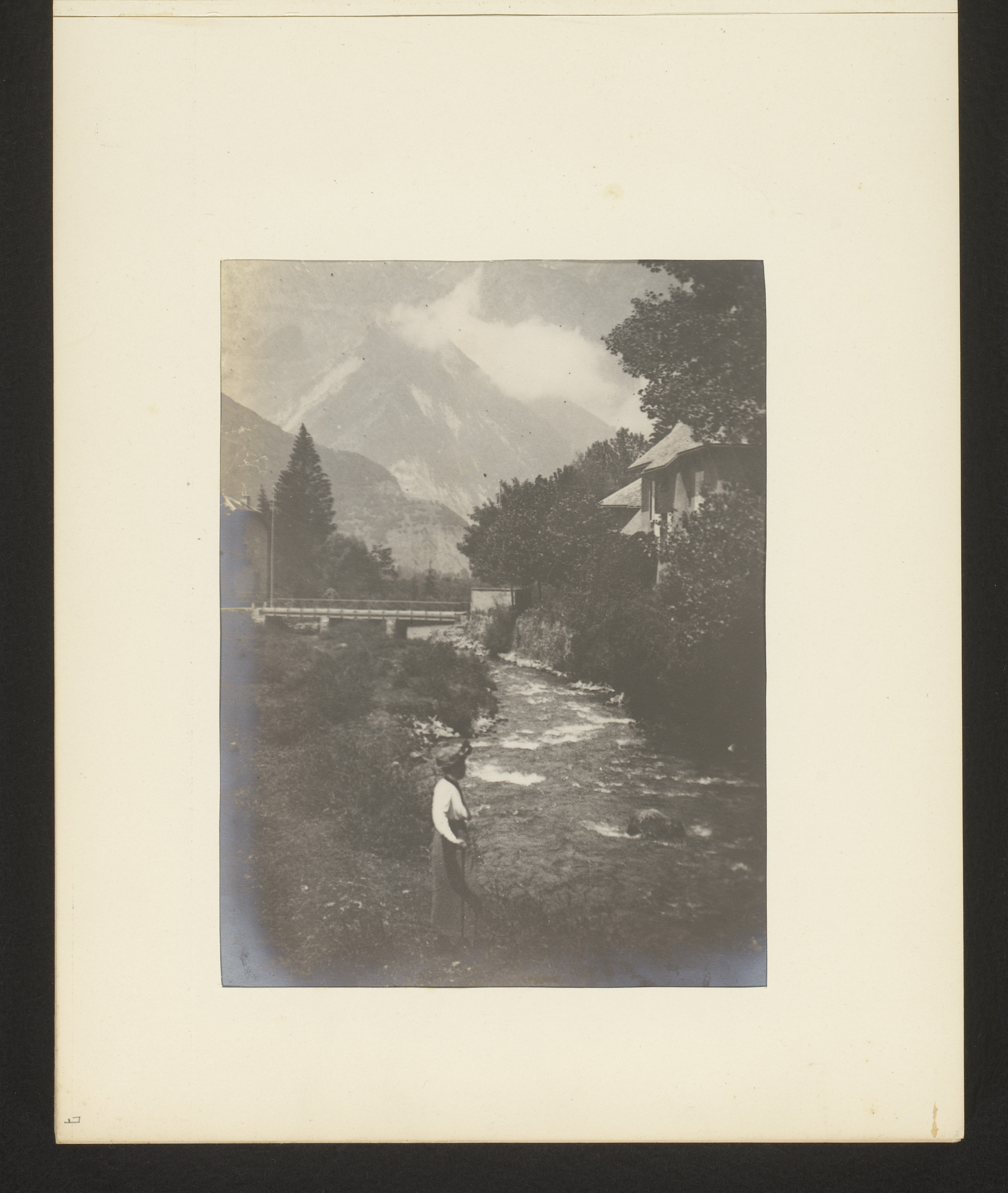 Gezicht op een bergbeek met op de voorgrond een vrou...