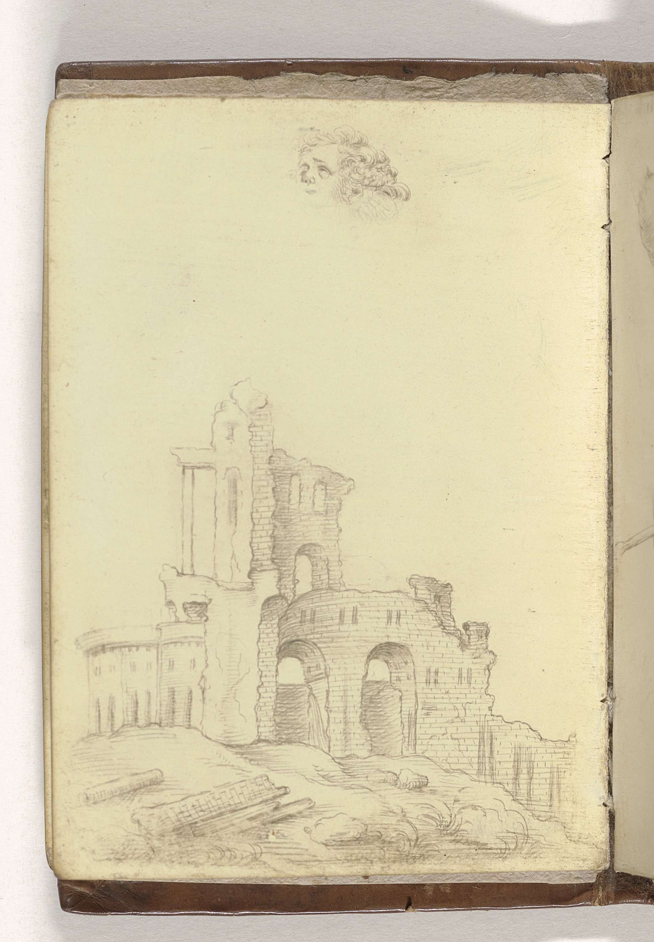 Schets van een ruïne en hoofd van kind