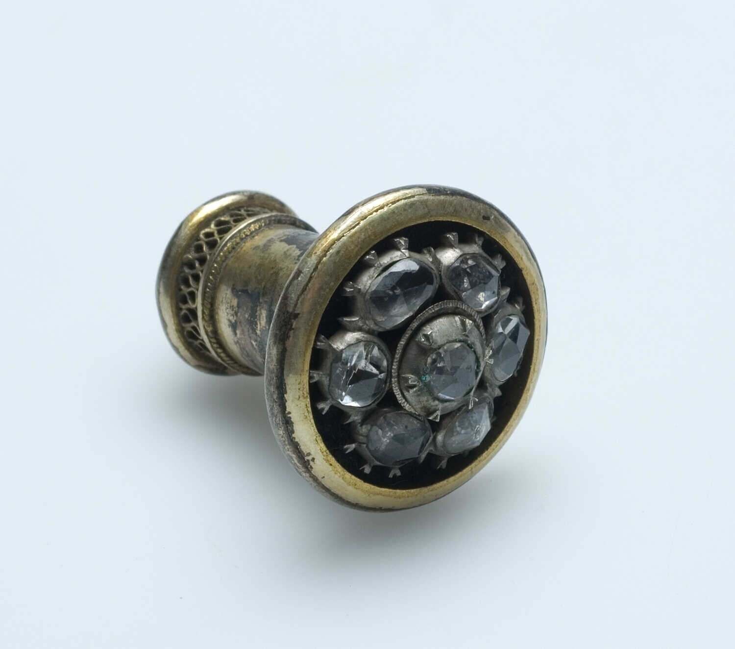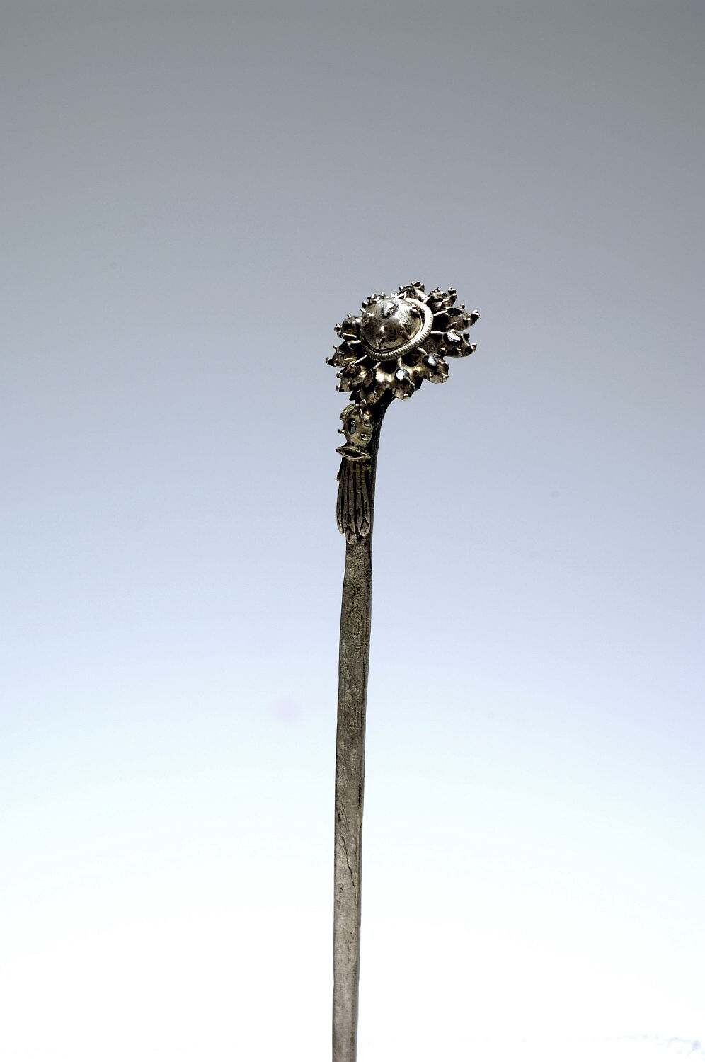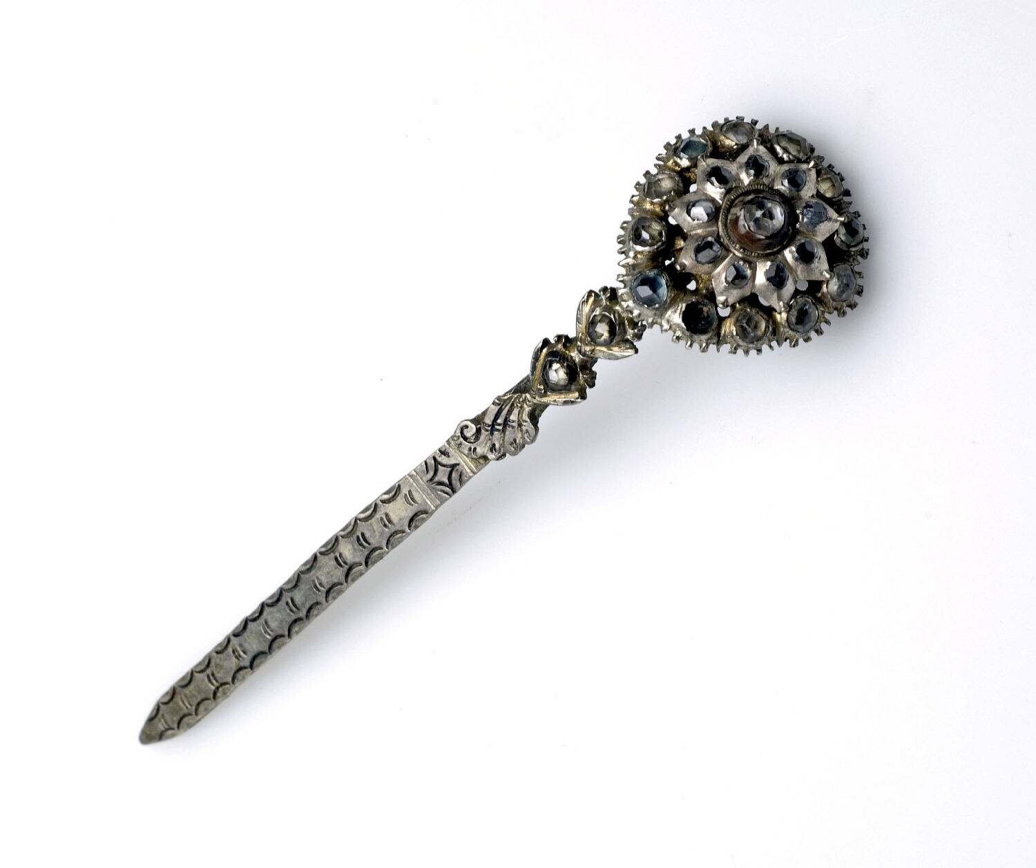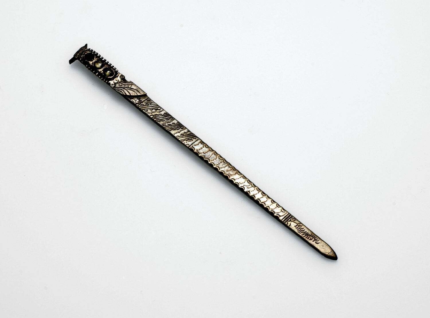 Zilveren haarnaald met ingelegde steentjes van glas