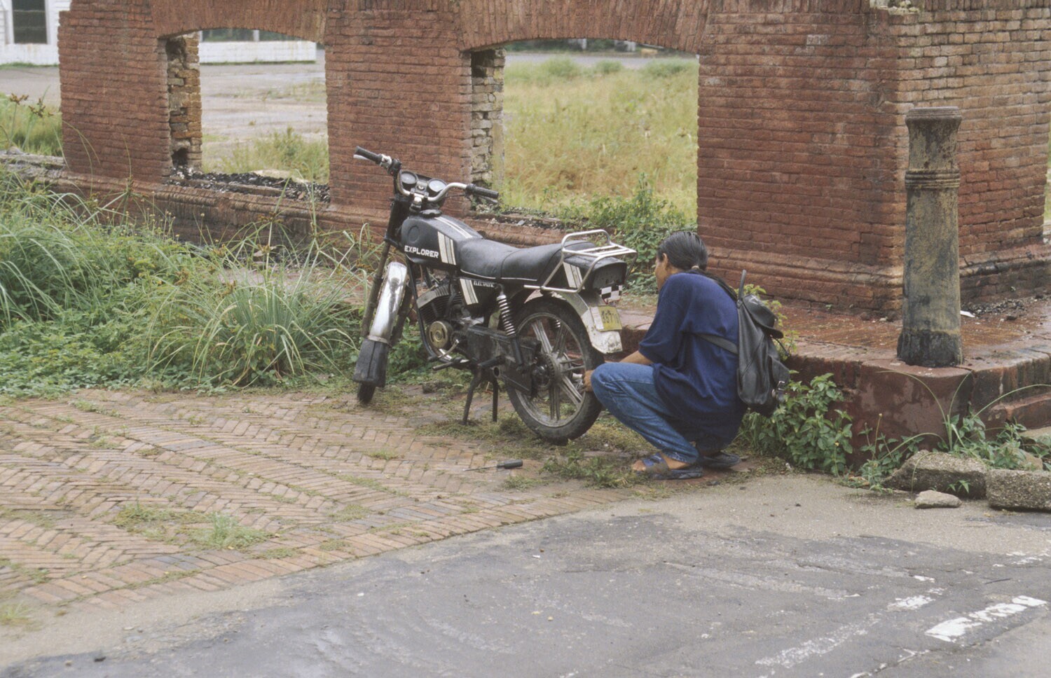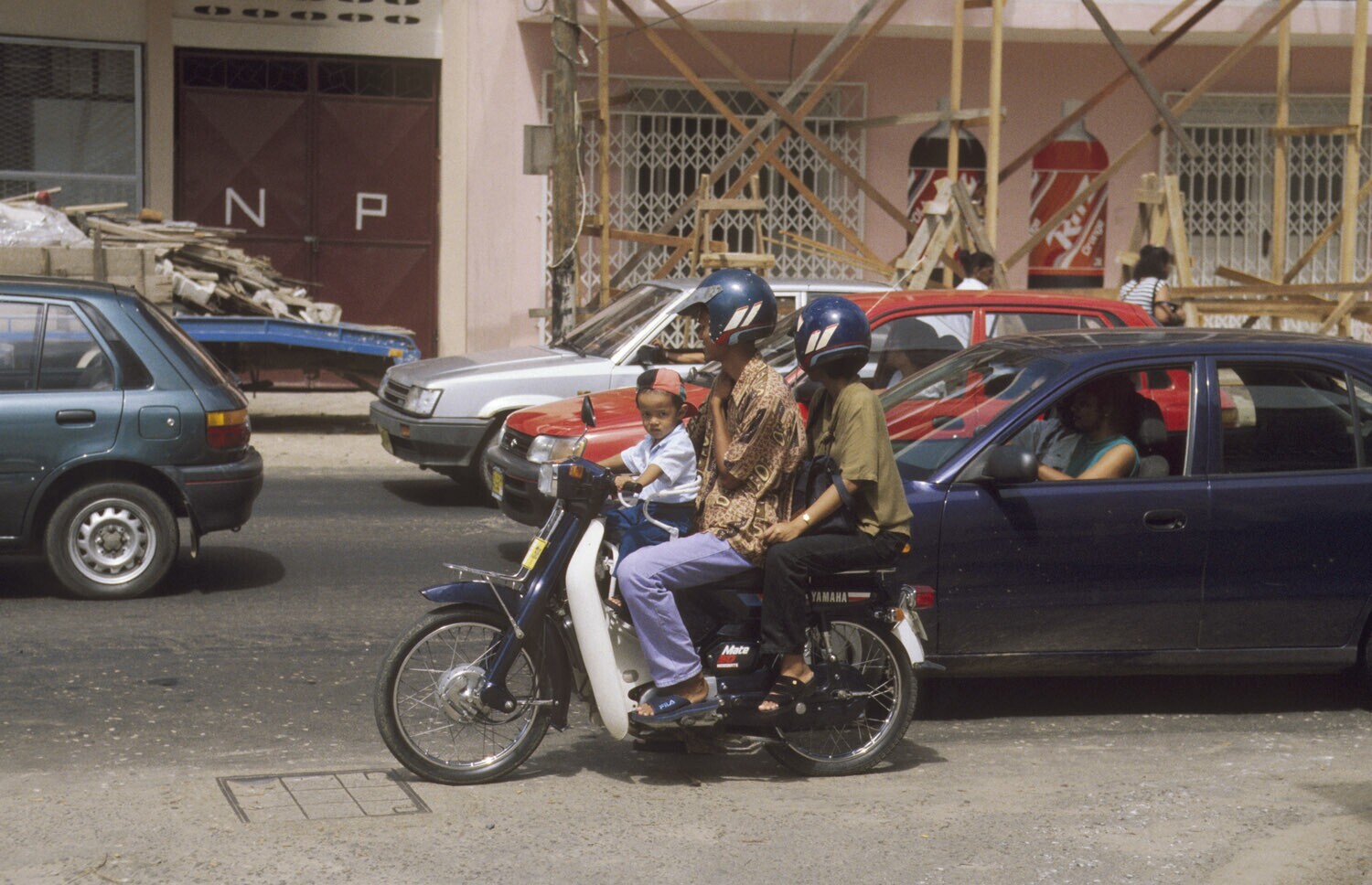 Paramaribo, straatbeeld, iemand repareert zijn bromm...