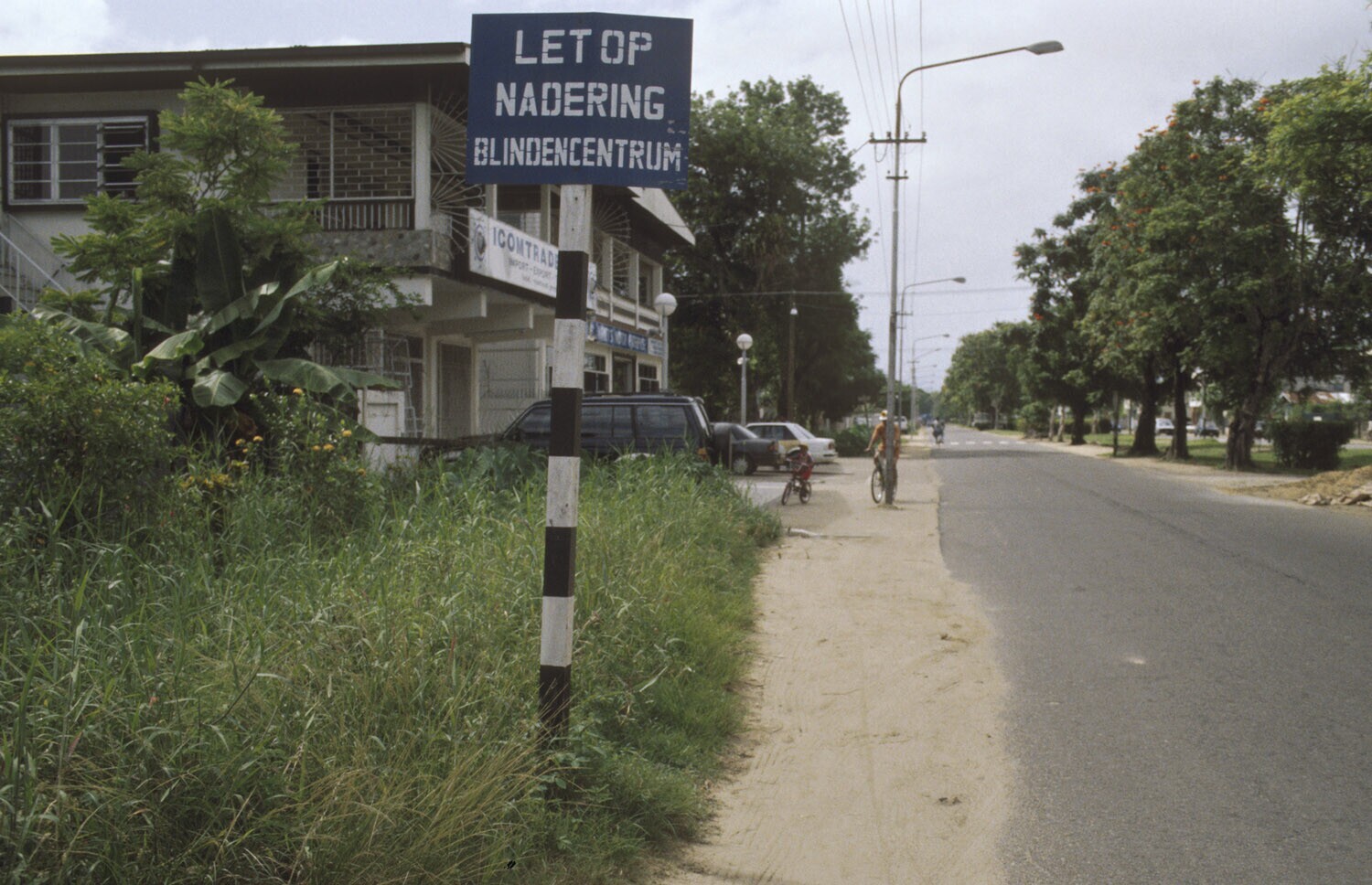 Paramaribo, straatbeeld, bord: let op nadering blind...