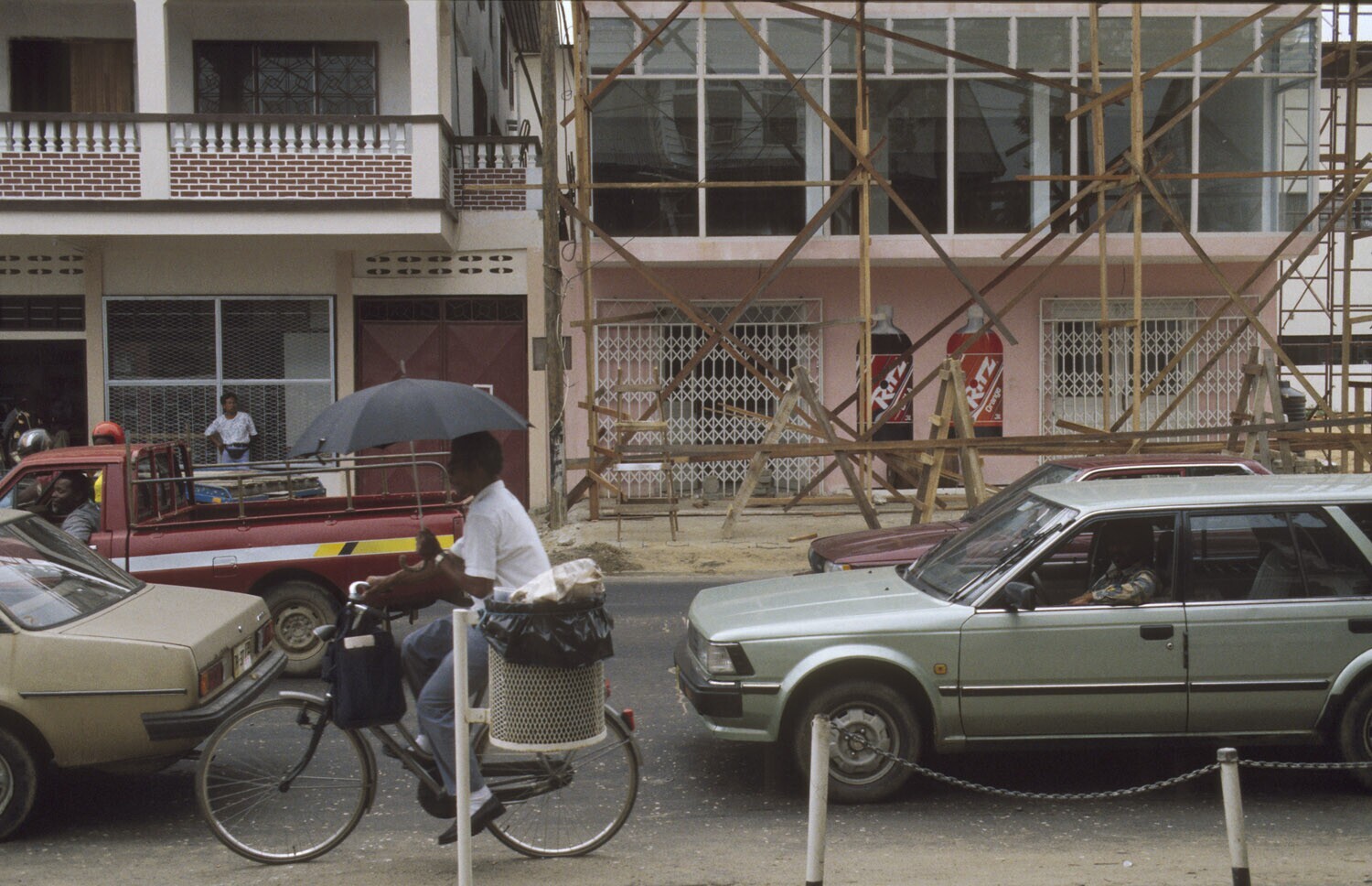 Paramaribo, straatbeeld, fietser met grote vissenkop...