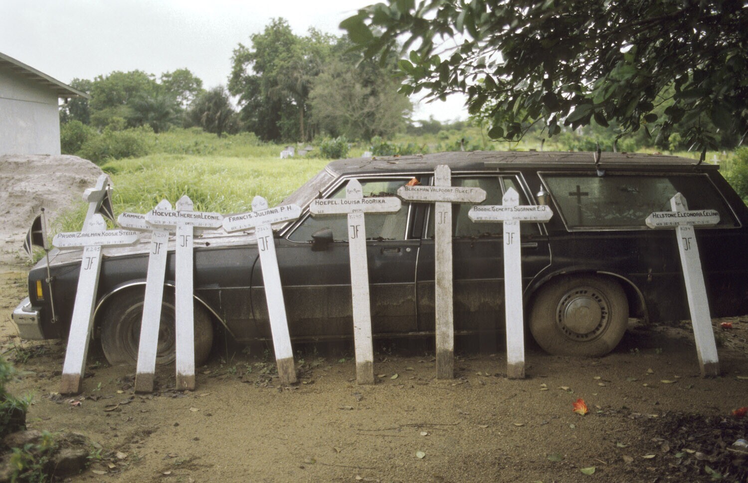 Paramaribo, straatbeeld, kruizen tegen een begrafeni...