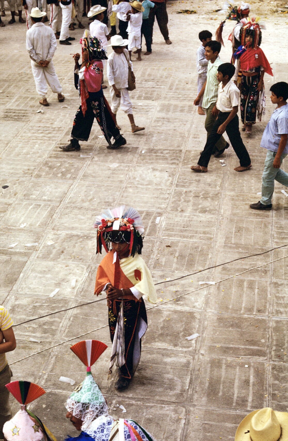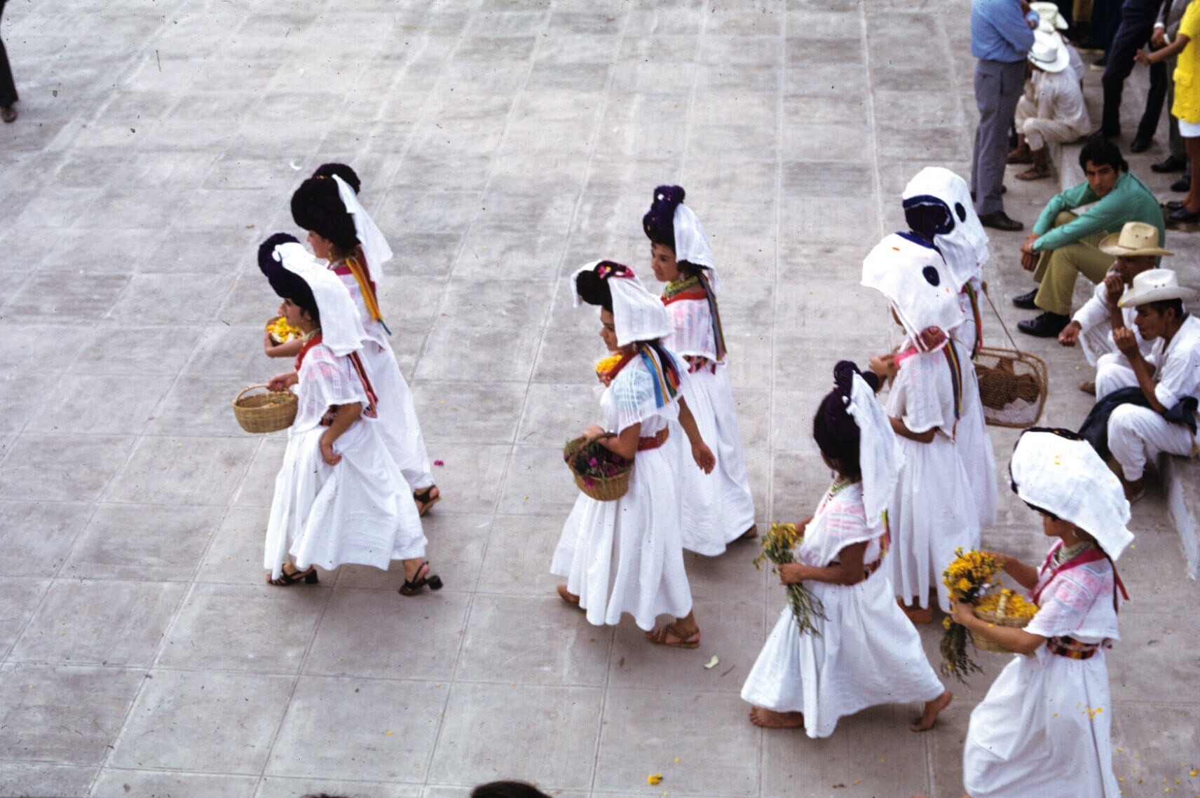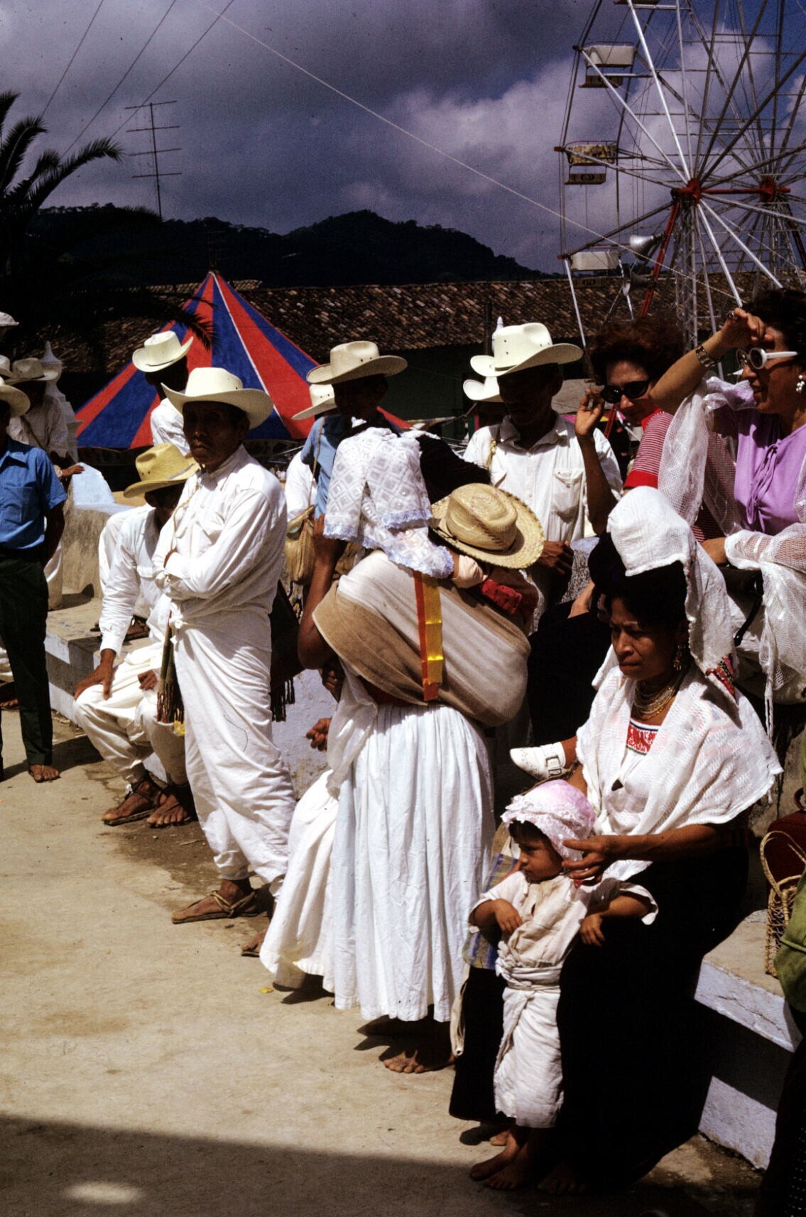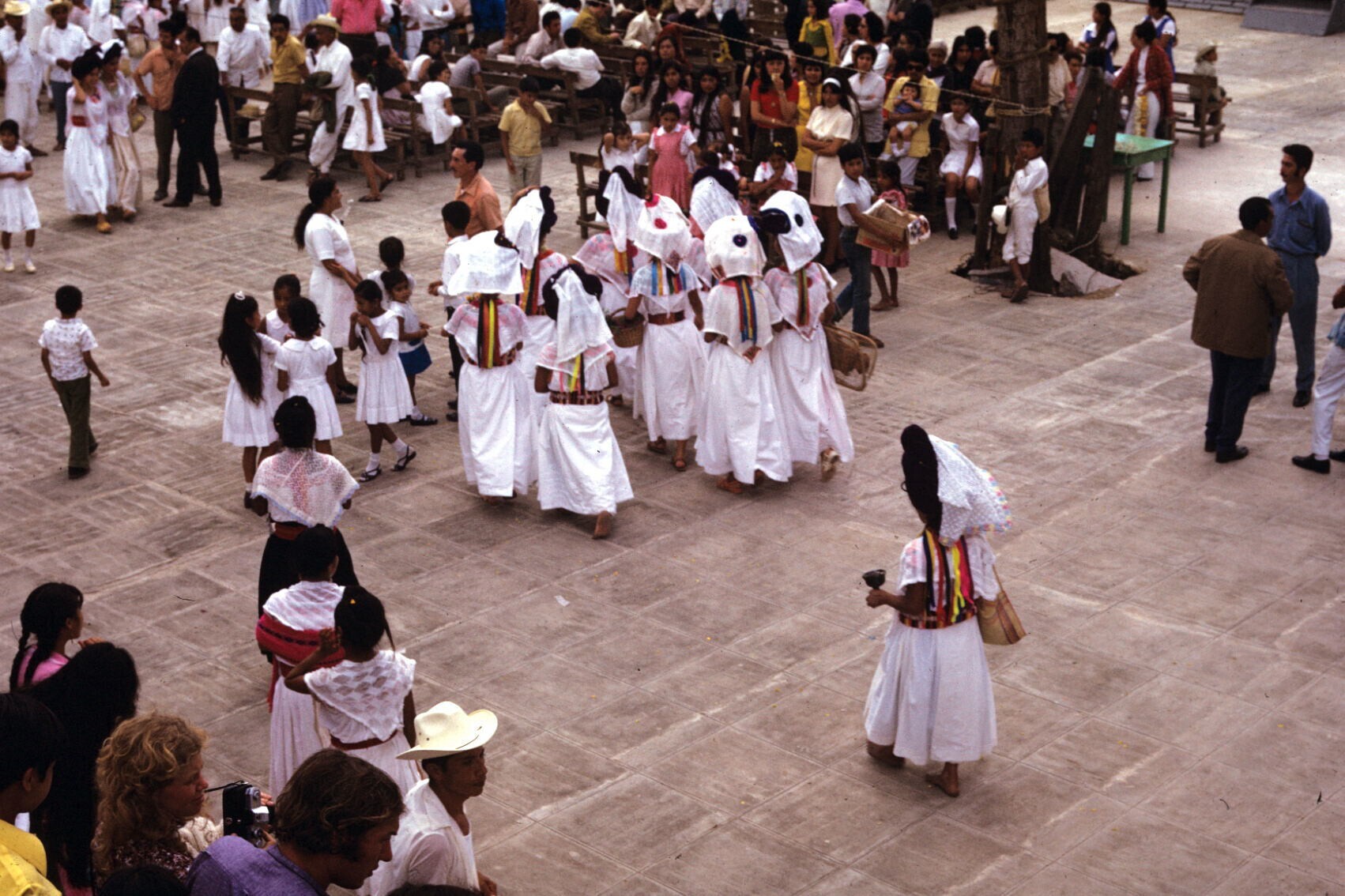 toeschouwers in feestkleding; NB kindje in "hua'cal"...