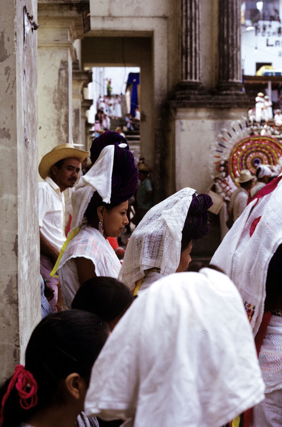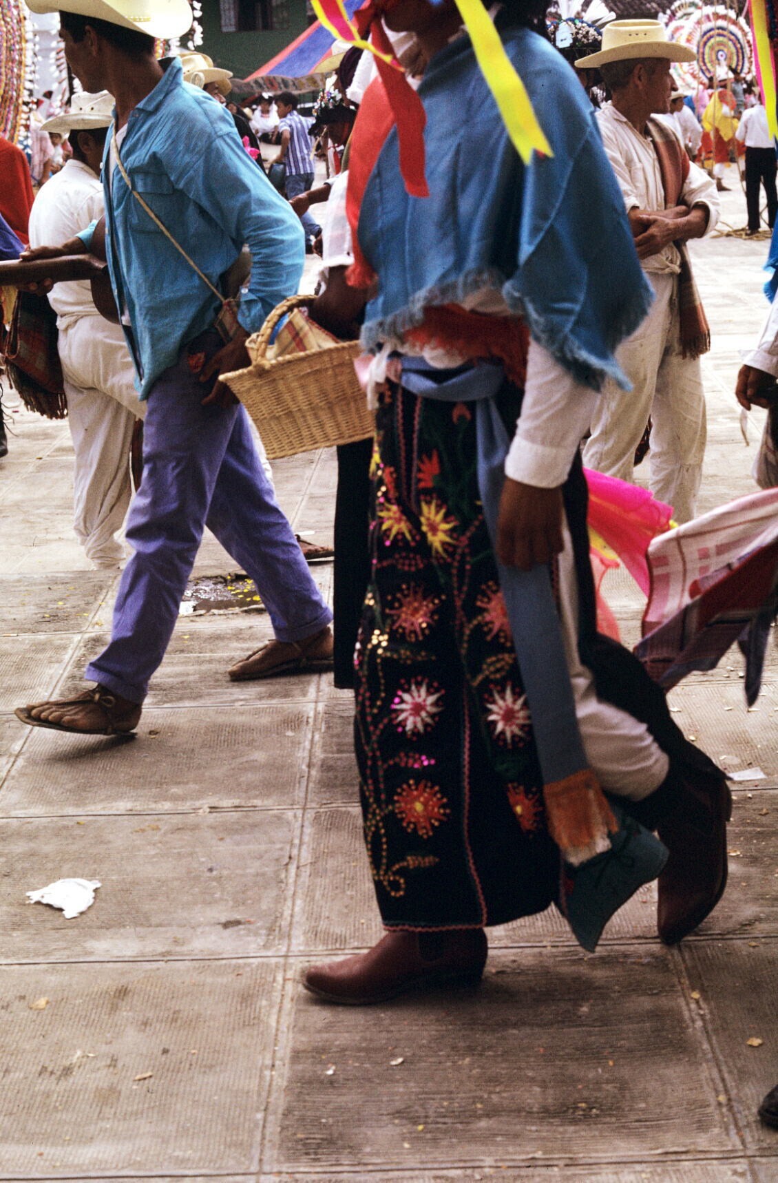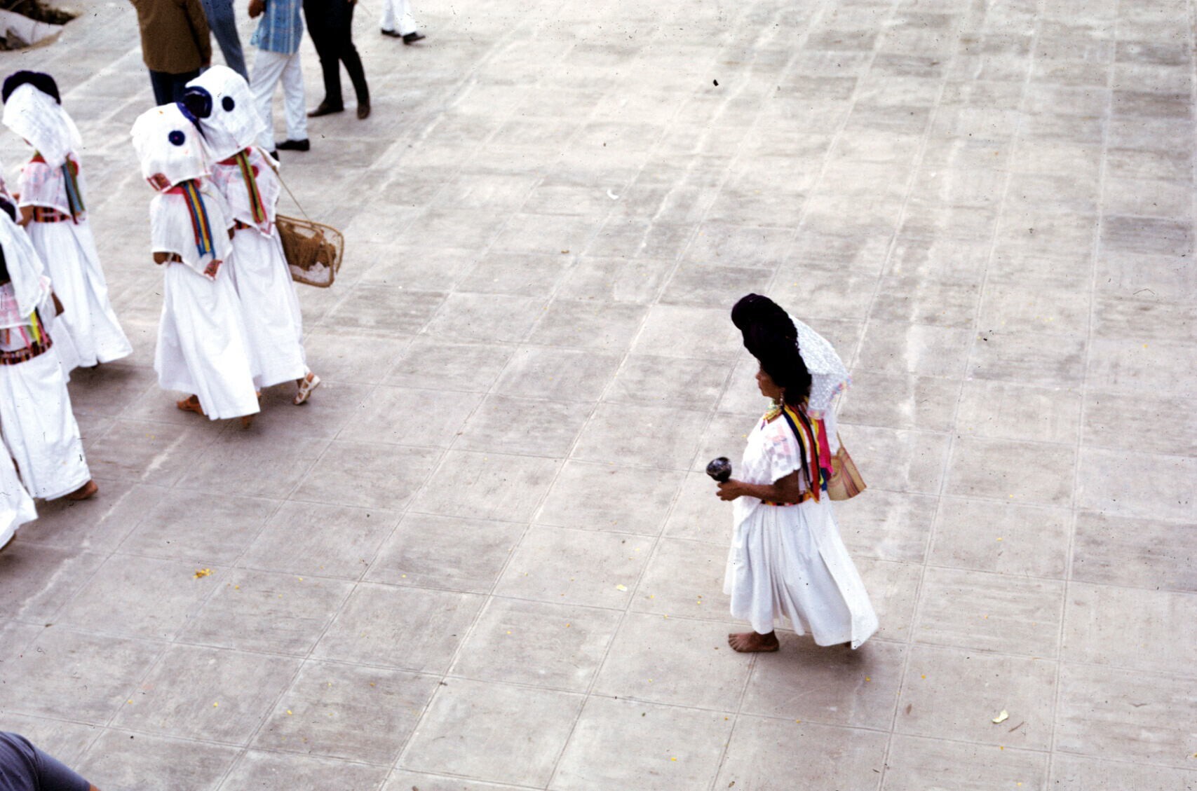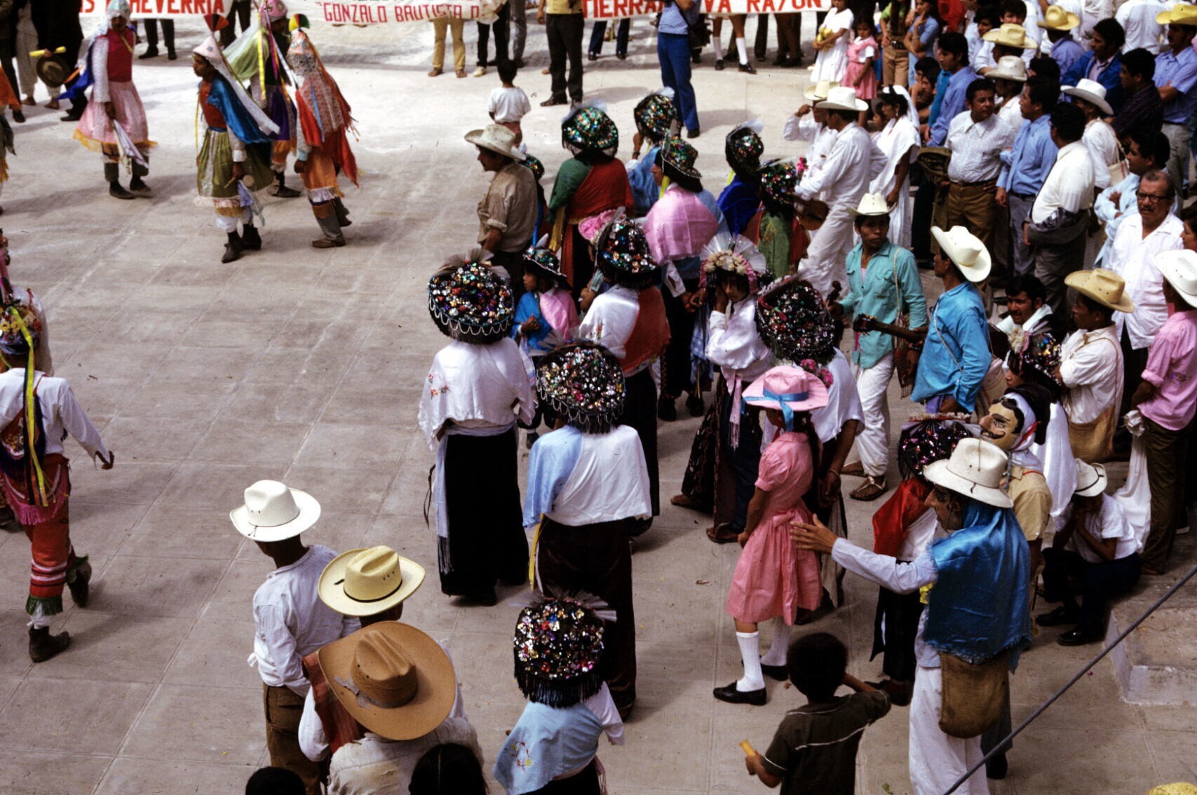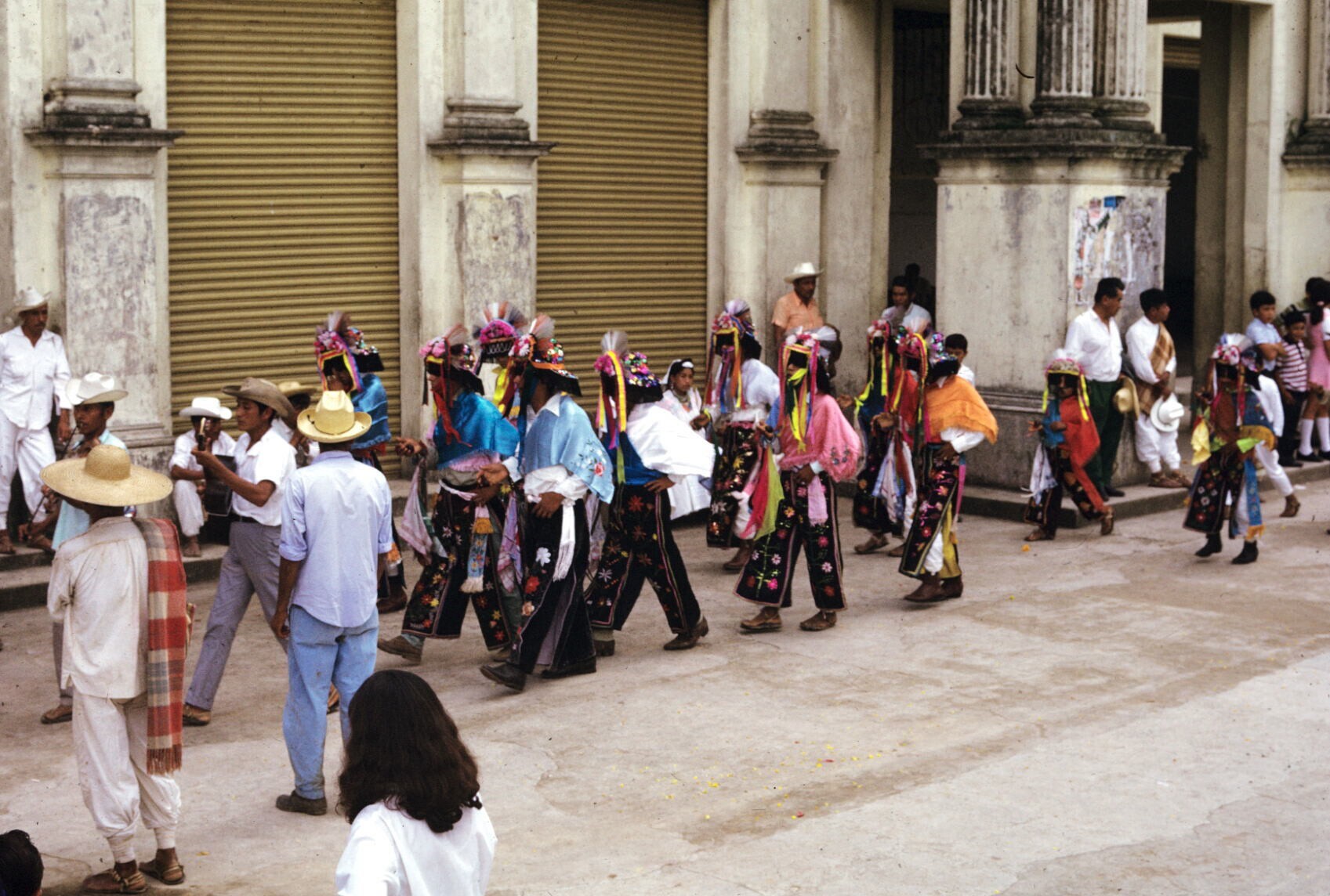 toeschouwers in feestkleding; NB kindje in "hua'cal"...