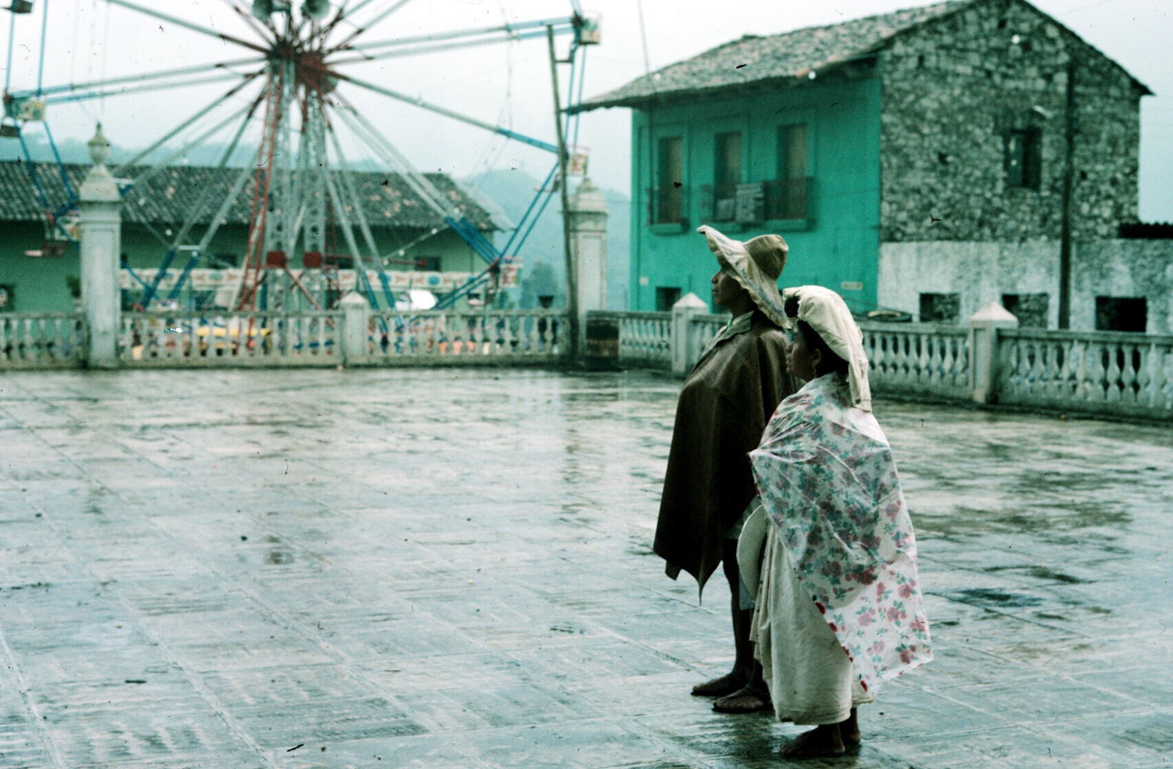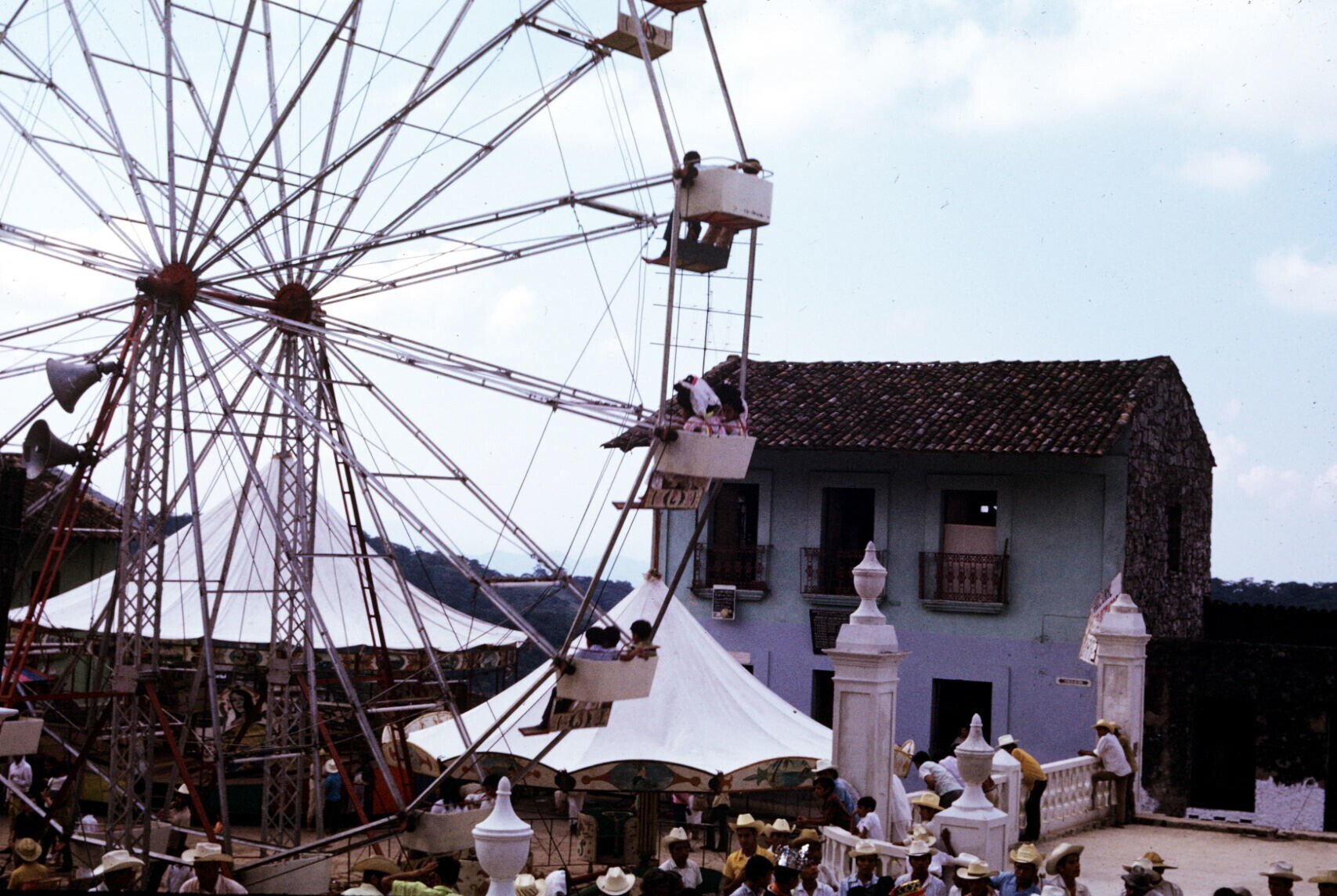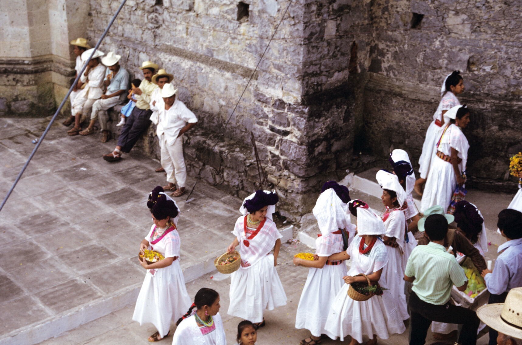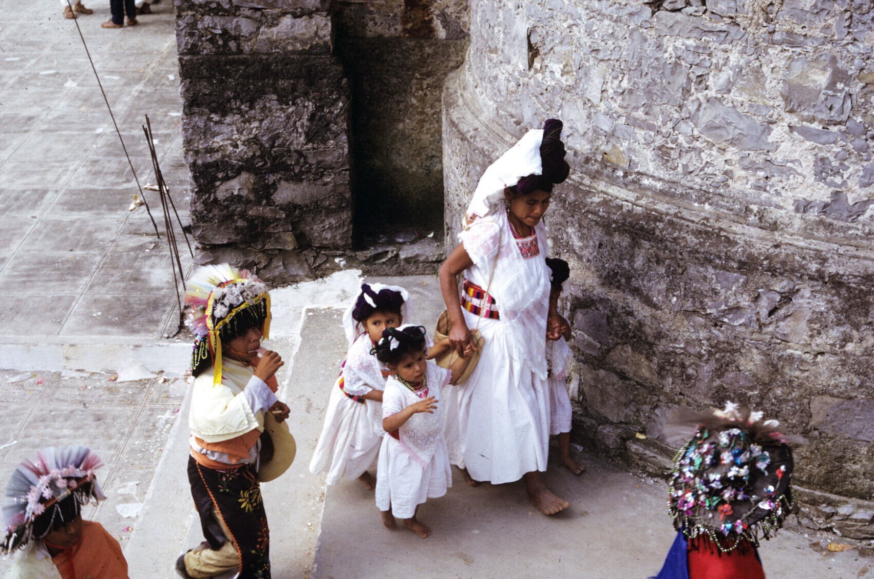 toeschouwers in feestkleding; NB kindje in "hua'cal"...