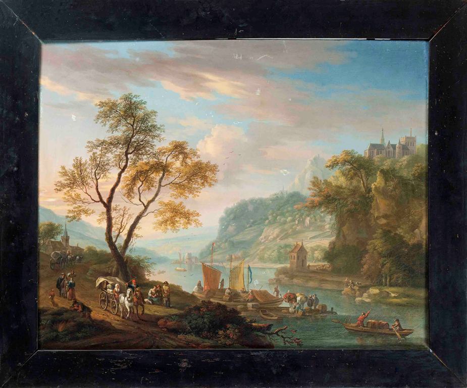 Arcadisch landschap met rivier, brug, boom, ruiter, ...