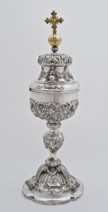 Zilveren ciborie met deksel waarop goudkleurig kruis
