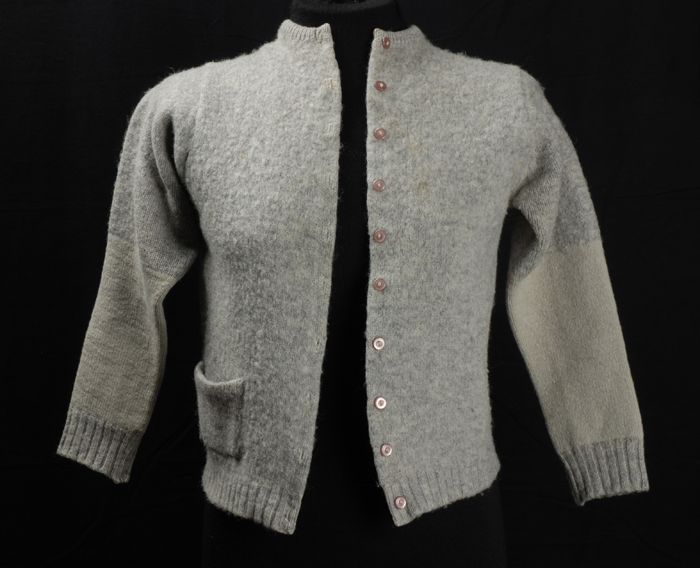 Gebreid vest van grijze wol, mouwen hersteld met tus...