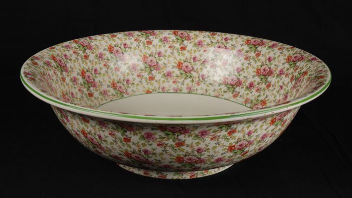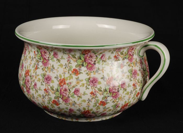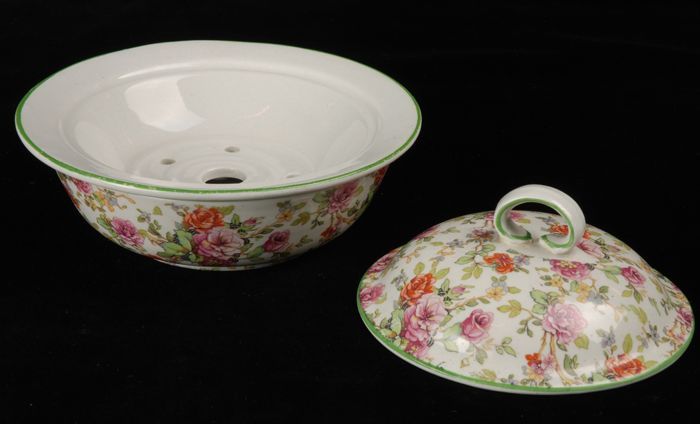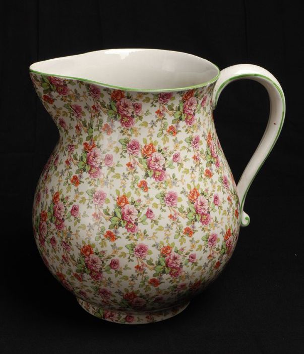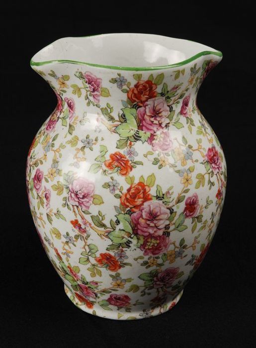 Witte lampetkan met groene rand en meerkleurige bloemen