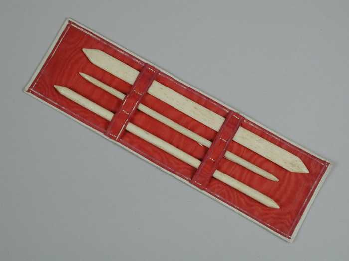 Naaldenmap van wit karton met rood moiréezijden binn...