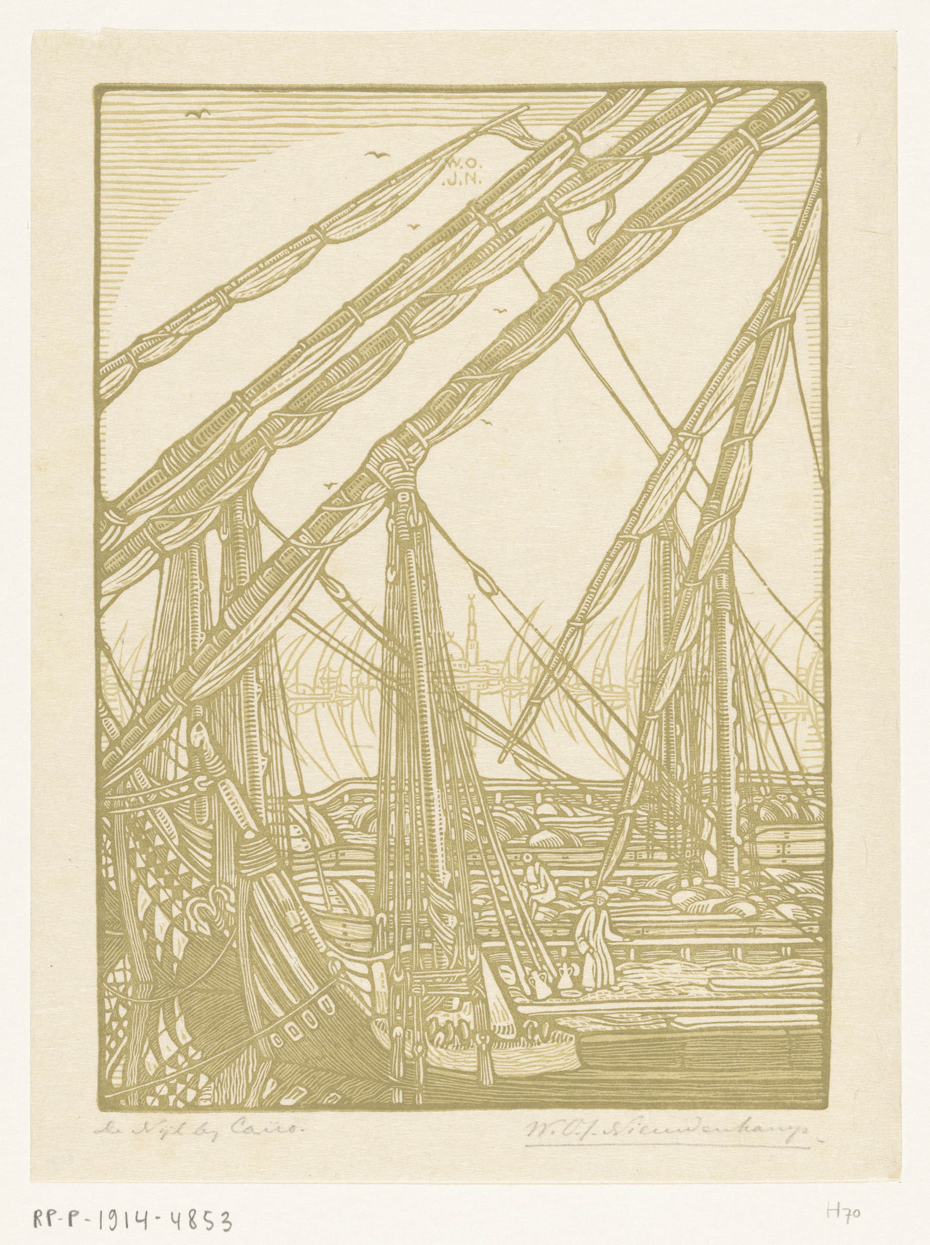 Afgemeerde zeilschepen op de Nijl bij Caïro