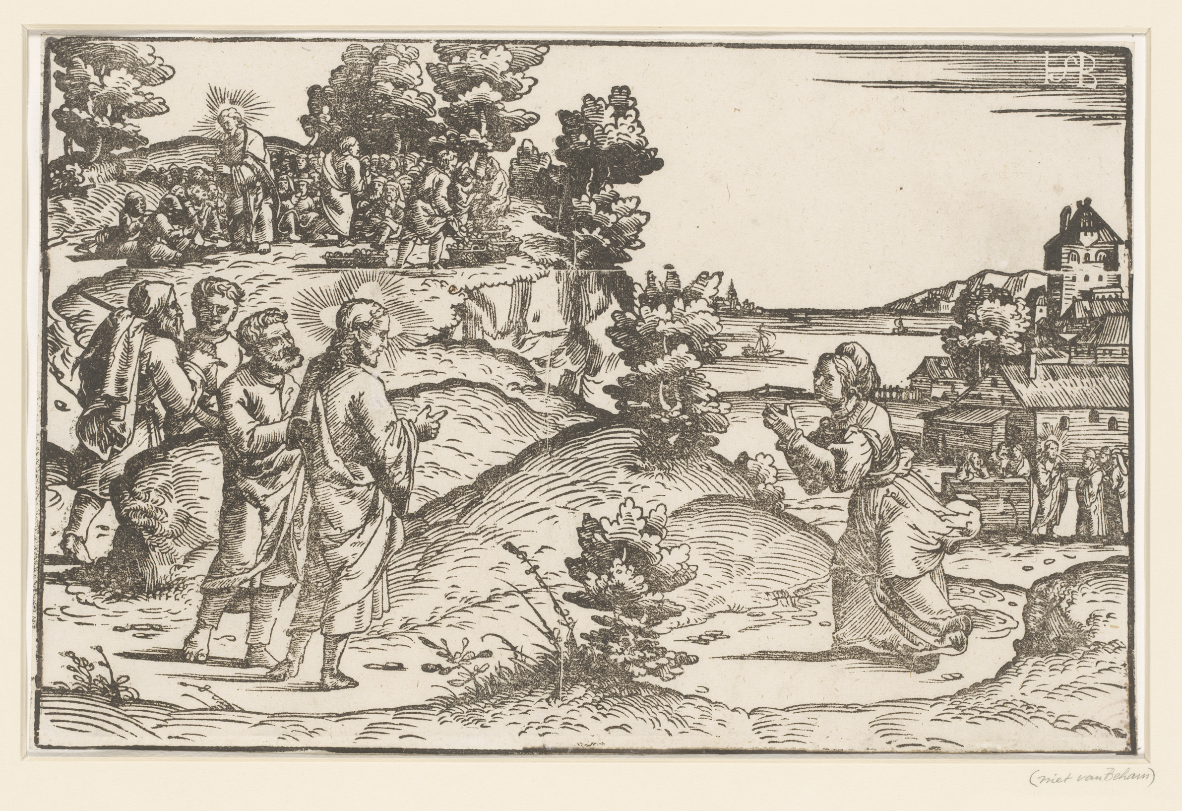Vrouw met een dood kind, knielend voor een vorst te ...