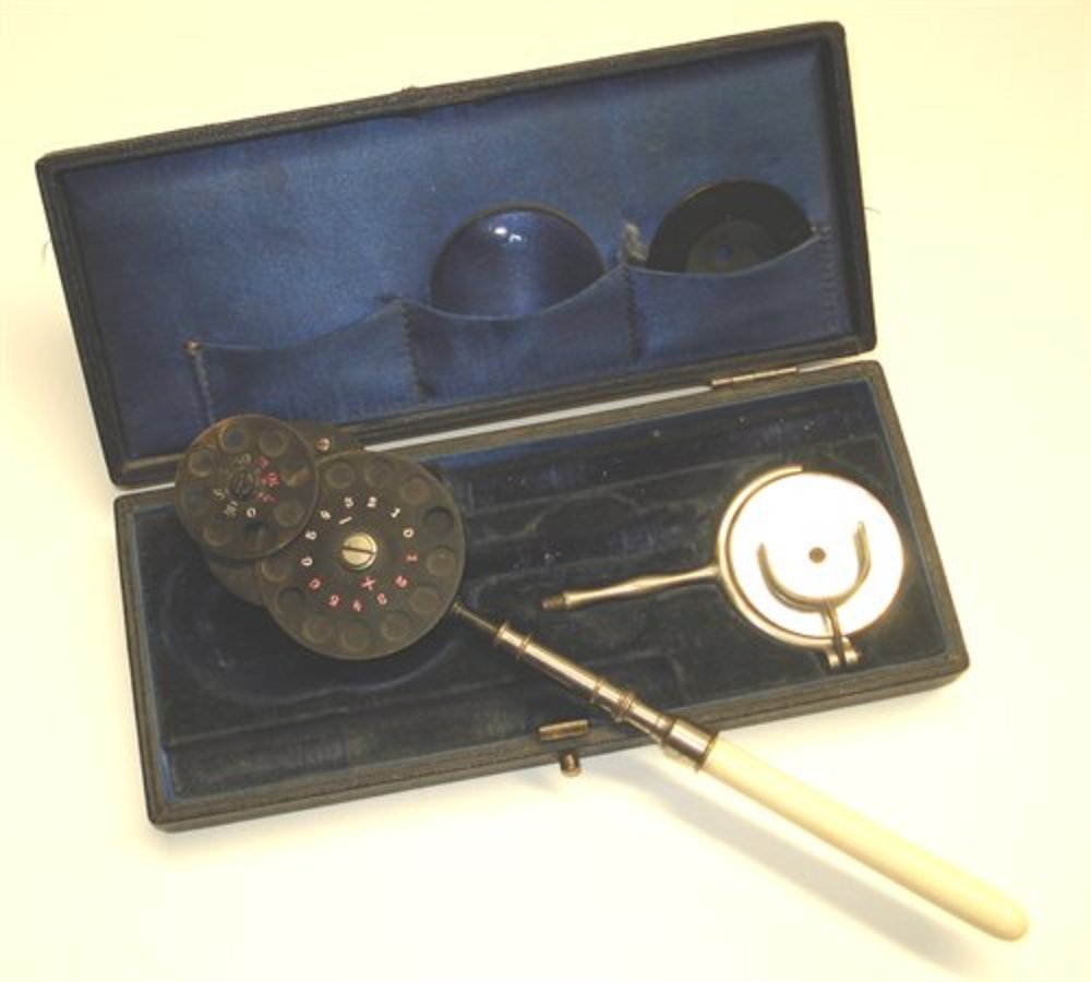 Doosje met oogmeetglaasjes en oogspiegel 1875-1925