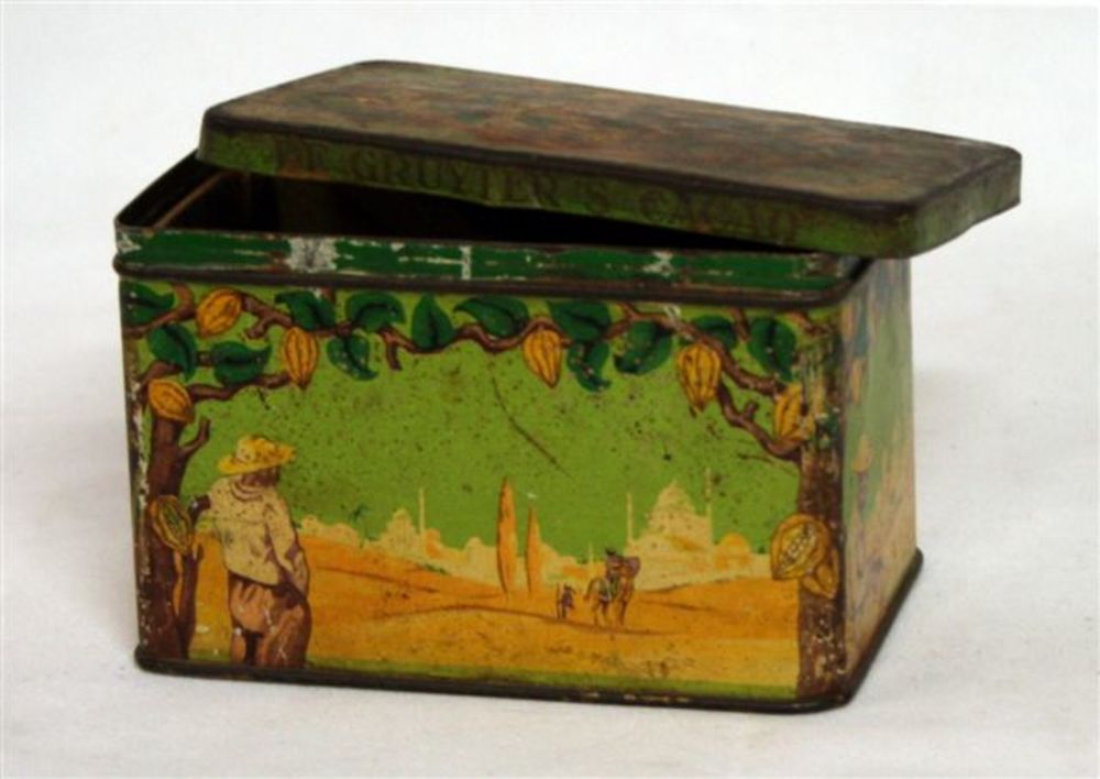cacaoblik. Vierkant kleurig blikje met scharnierend ...