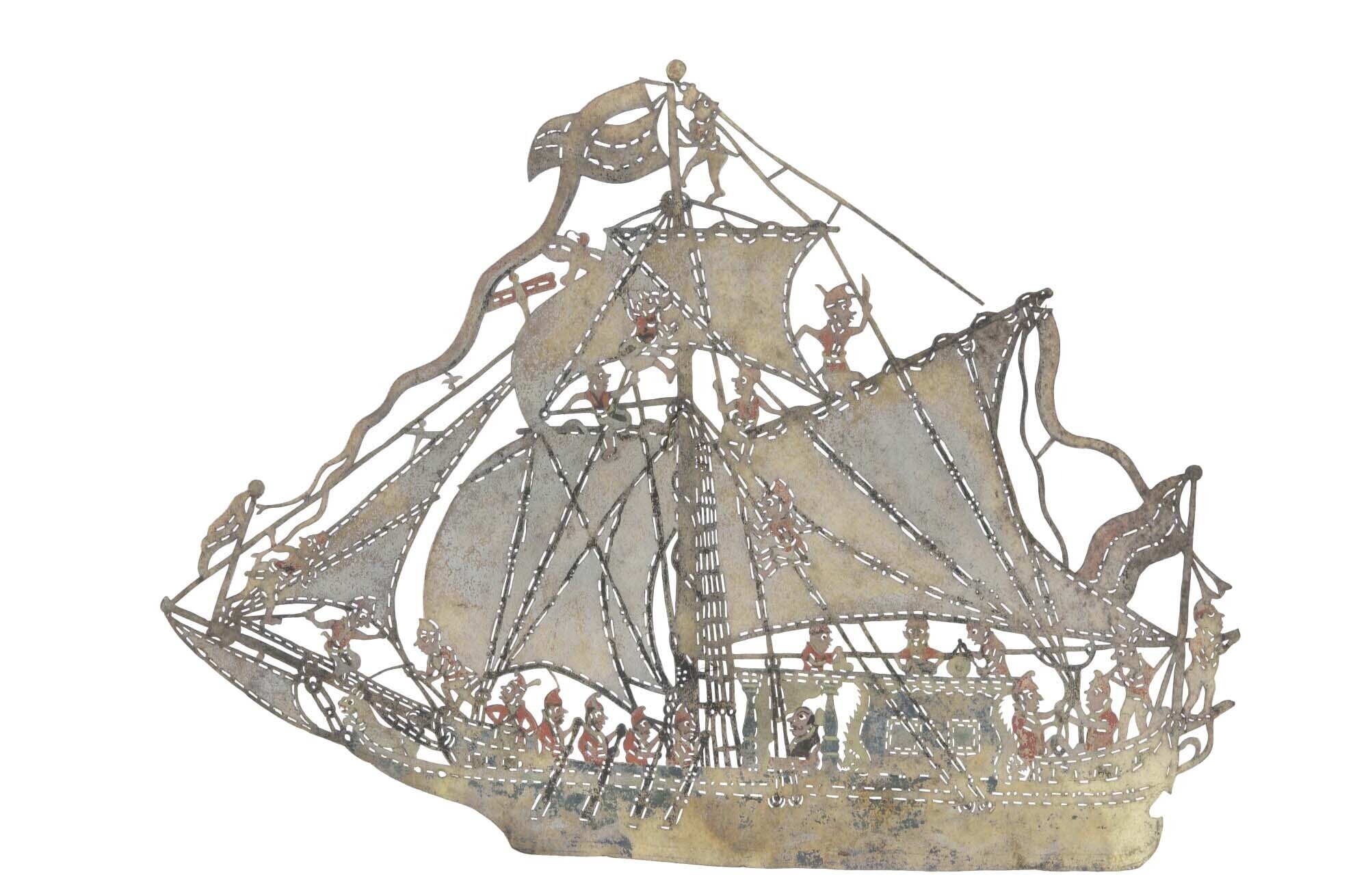 Wayang Gedog figuur: piratenschip met volle zeilen