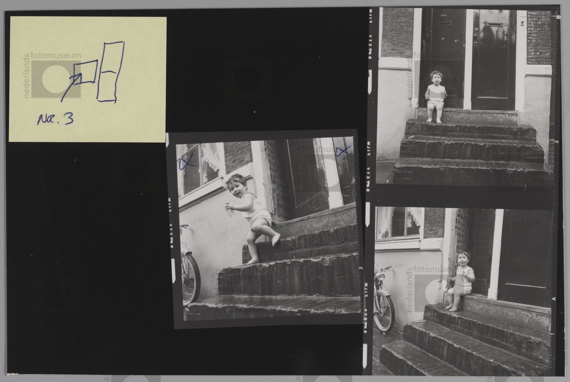 Amsterdam. Kind in ondergoed klimt van de stoep.