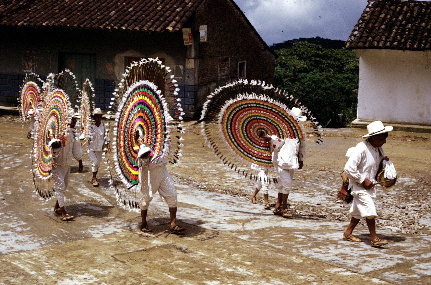 Quetzaldansers, met hoofdtooi zeulend, voorafgegaan ...
