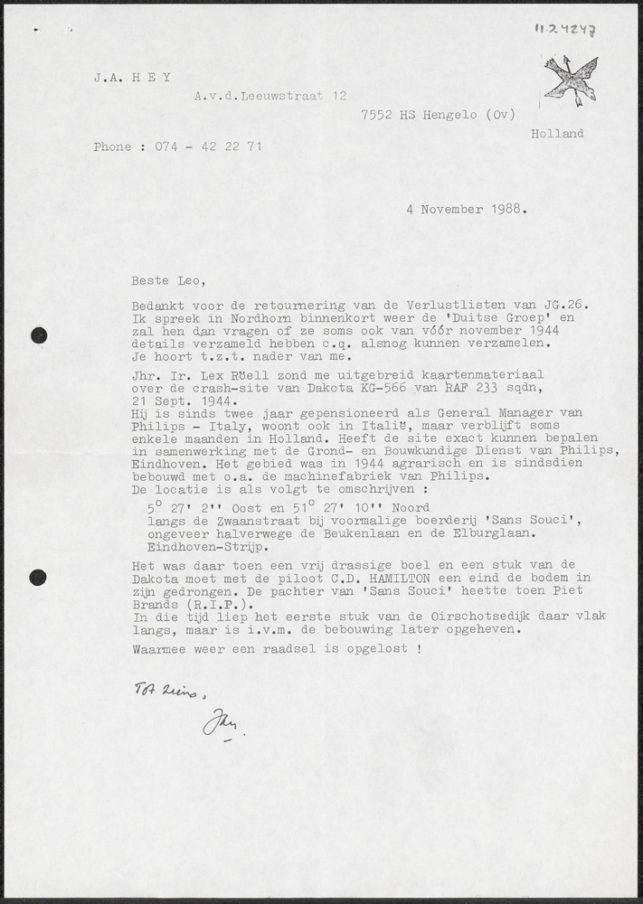 Brief van J.A. Hey over de crashplaats van de Dakota...