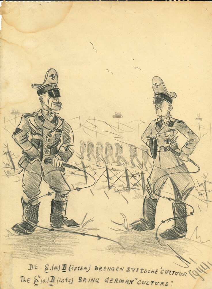 Tekening van twee Duitse Officieren met een zweep, v...