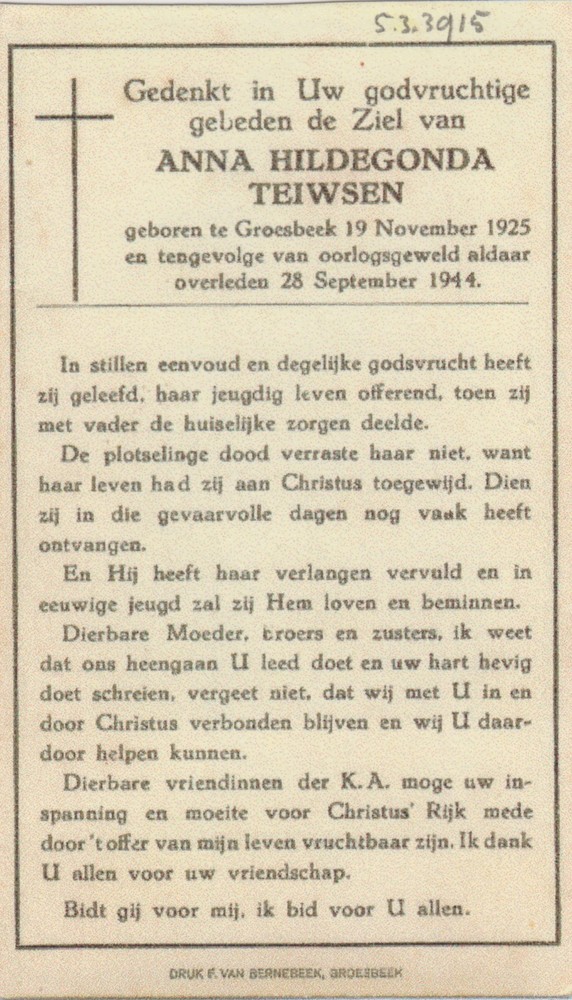 Bombardement Nijmegen; bidprentje A.H. Teiwsen