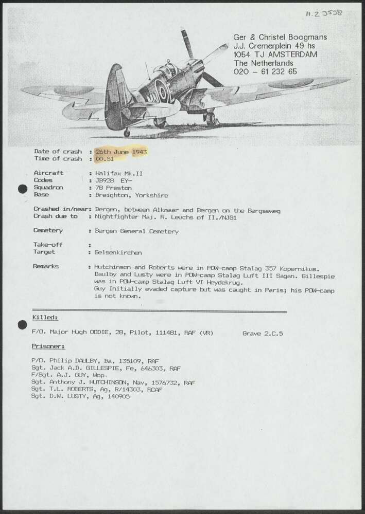 Crashrapport Halifax JB928 26 juni 1943.