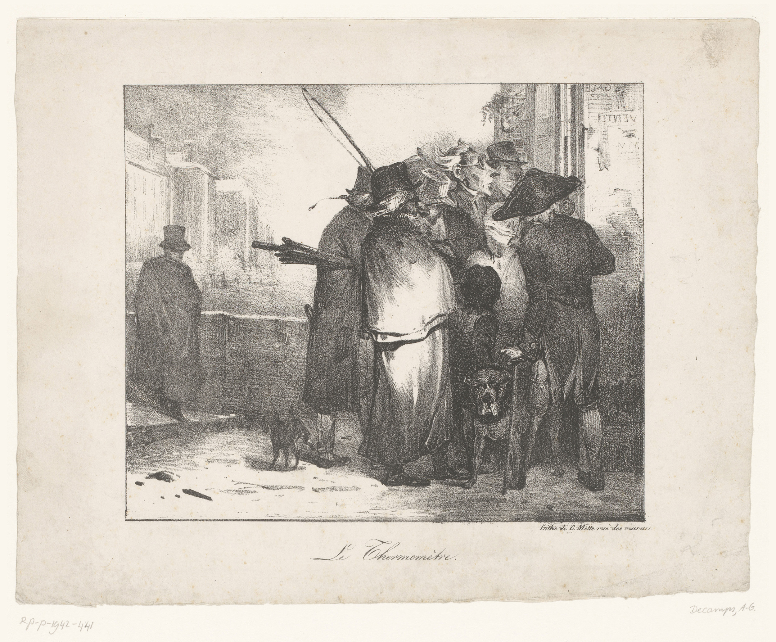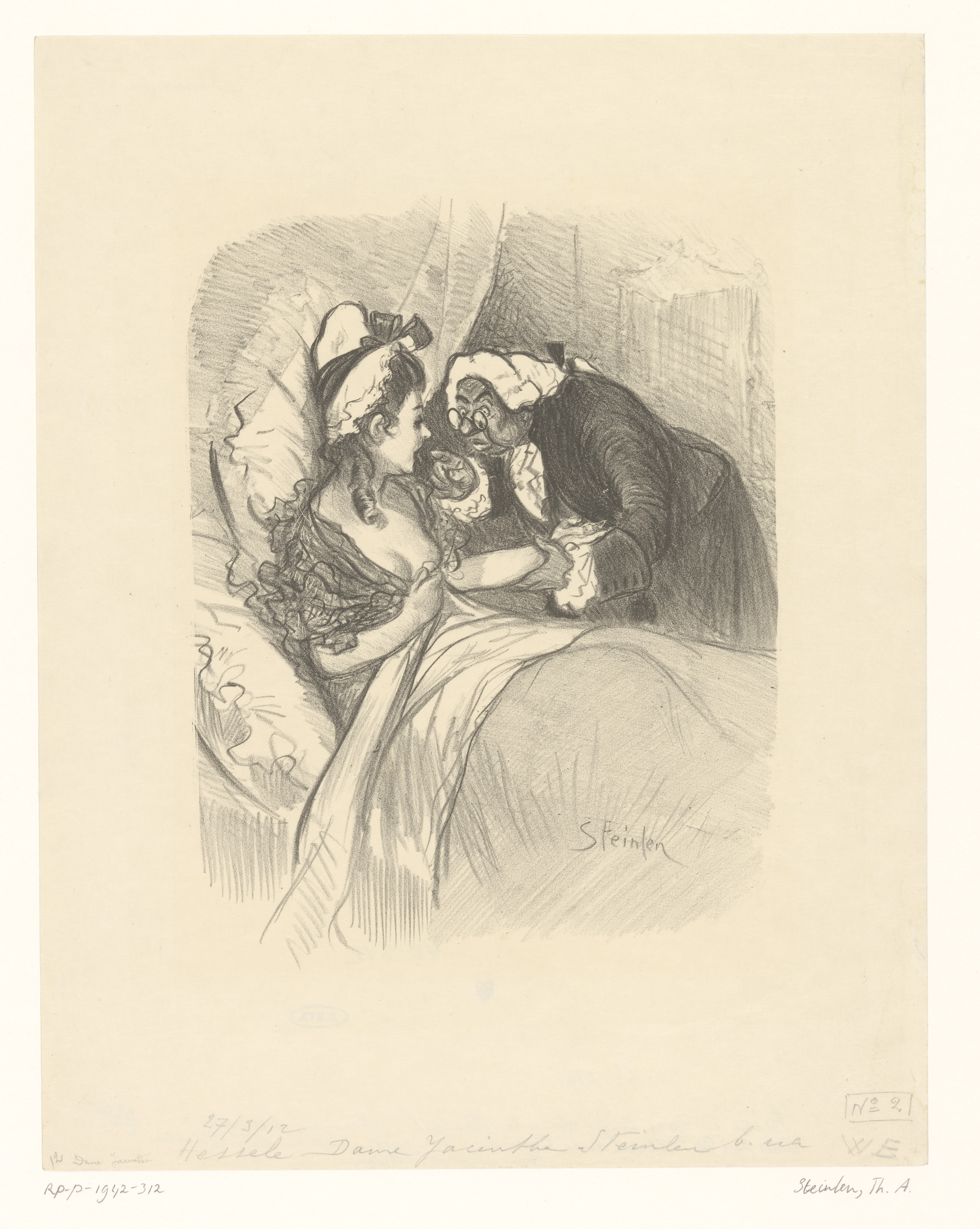Karikatuur van vijf artsen met pruiken die elkaar ra...