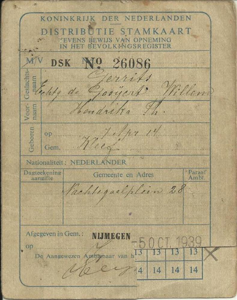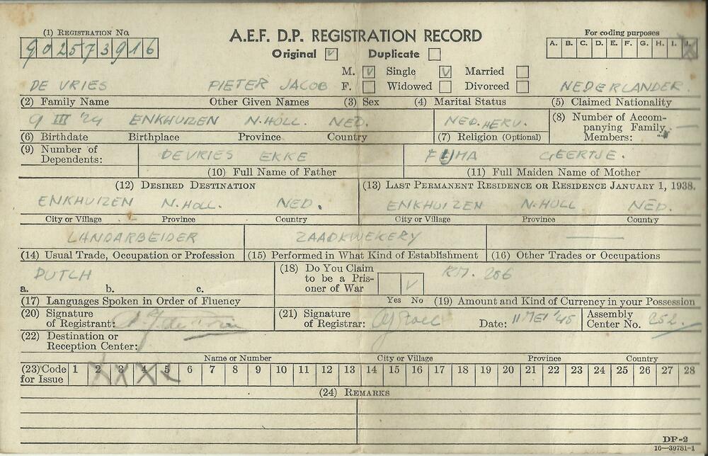 A.E.F. D.P. Registration Record op naam van , de Vri...