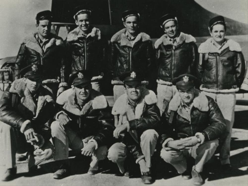 Foto van negen Amerikaanse viegers in vliegjacks. (z...