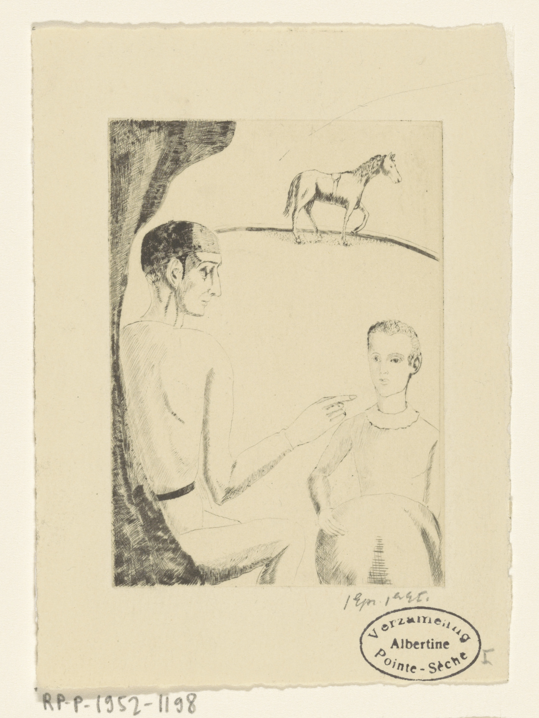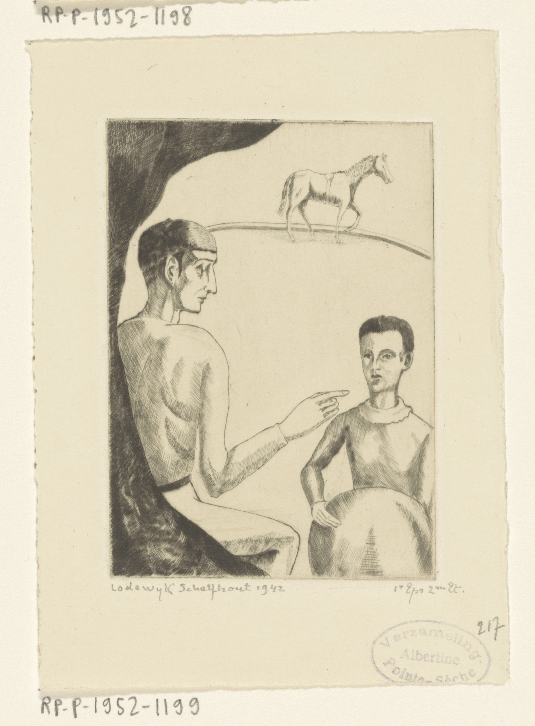 Twee acrobaten bij een circuspiste met paard
