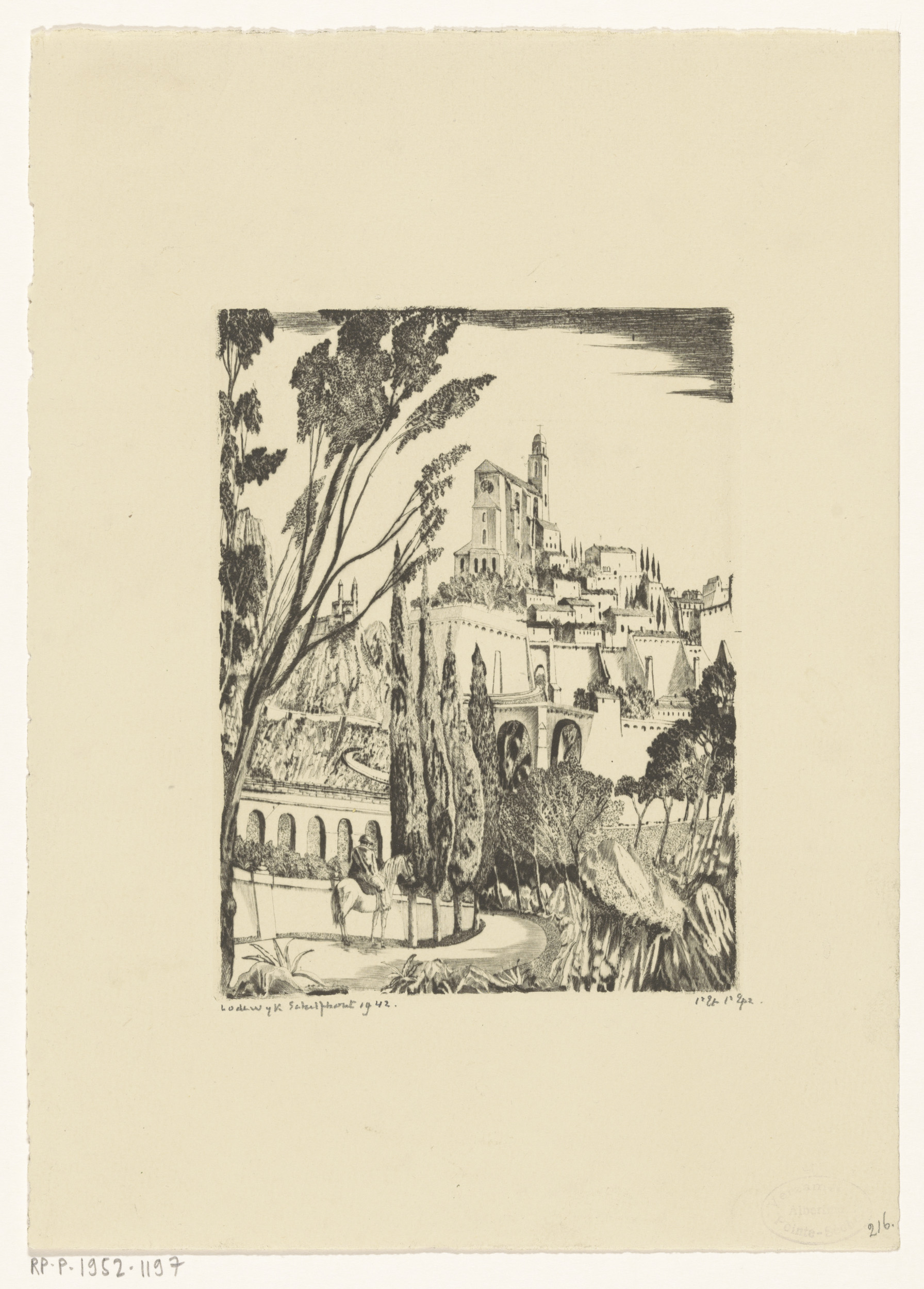 Ruiter te paard bij een stad op een heuvel