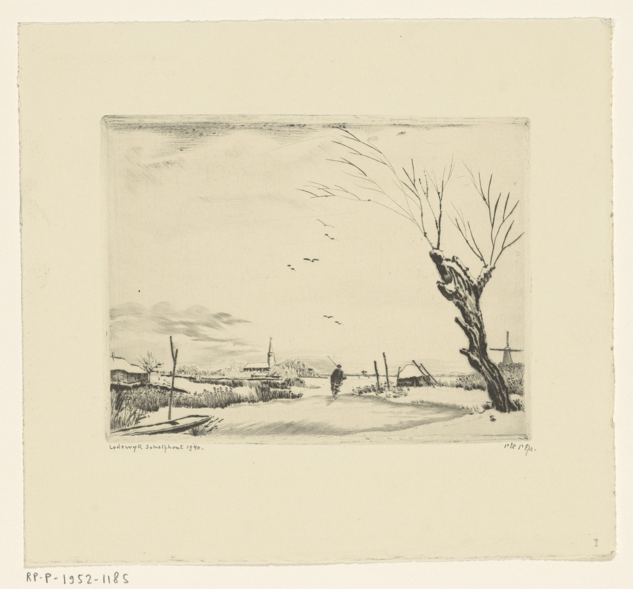 Winterlandschap met schuit, hooischuur en vogels