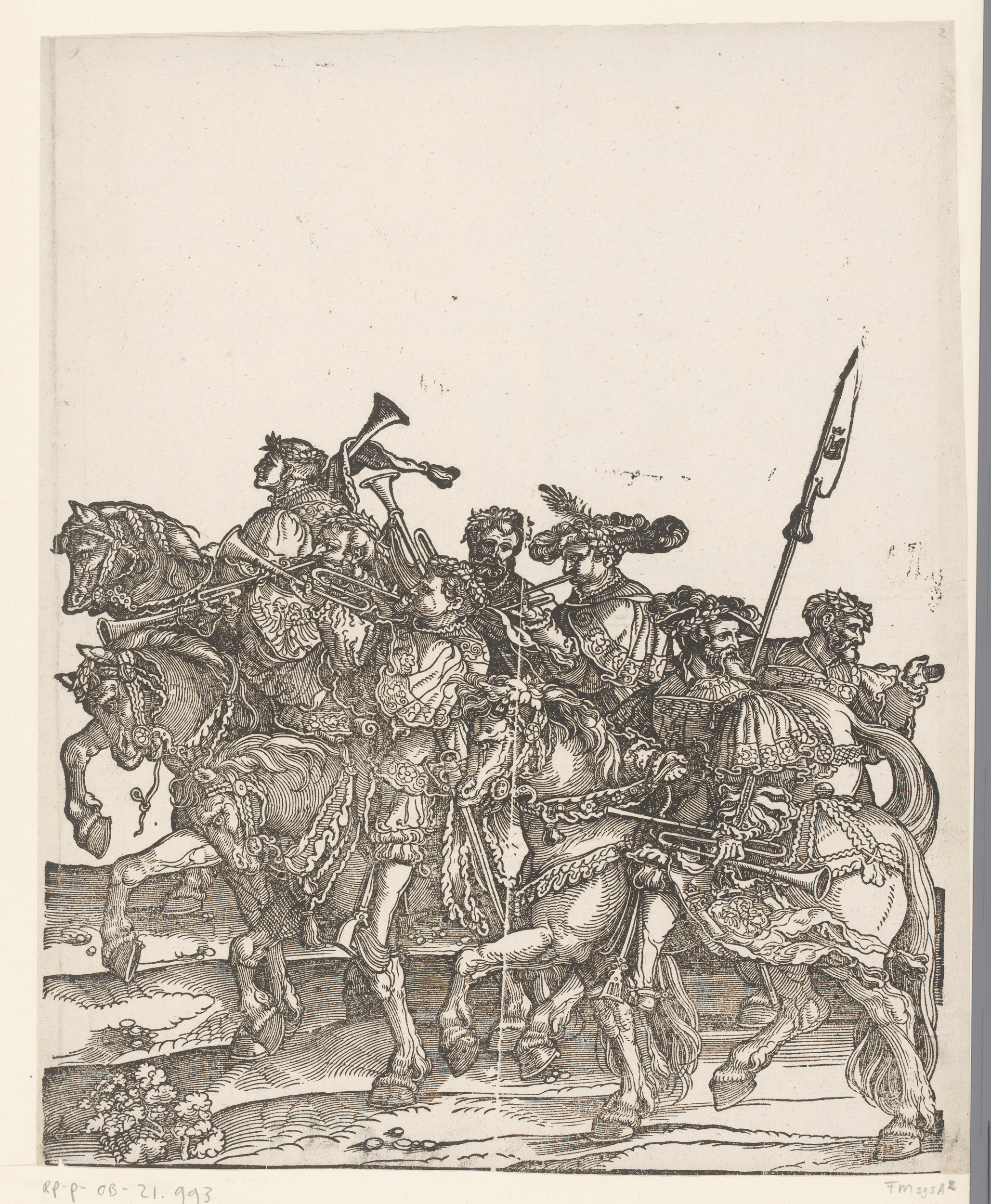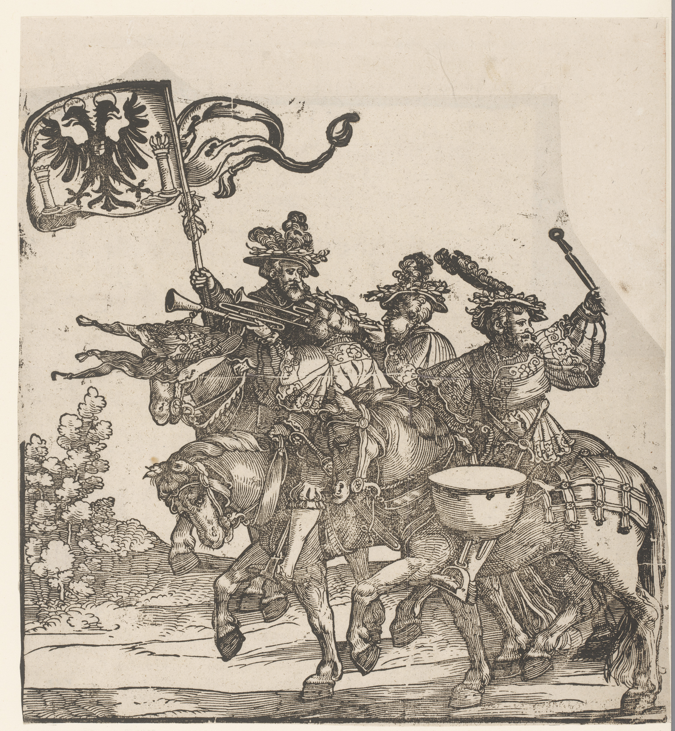 Muzikanten en vlaggendrager te paard