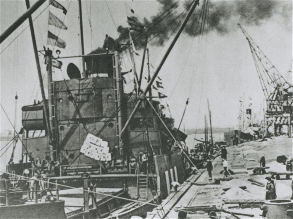 Foto van vrachtschip met rokende schoorsteen in haven.