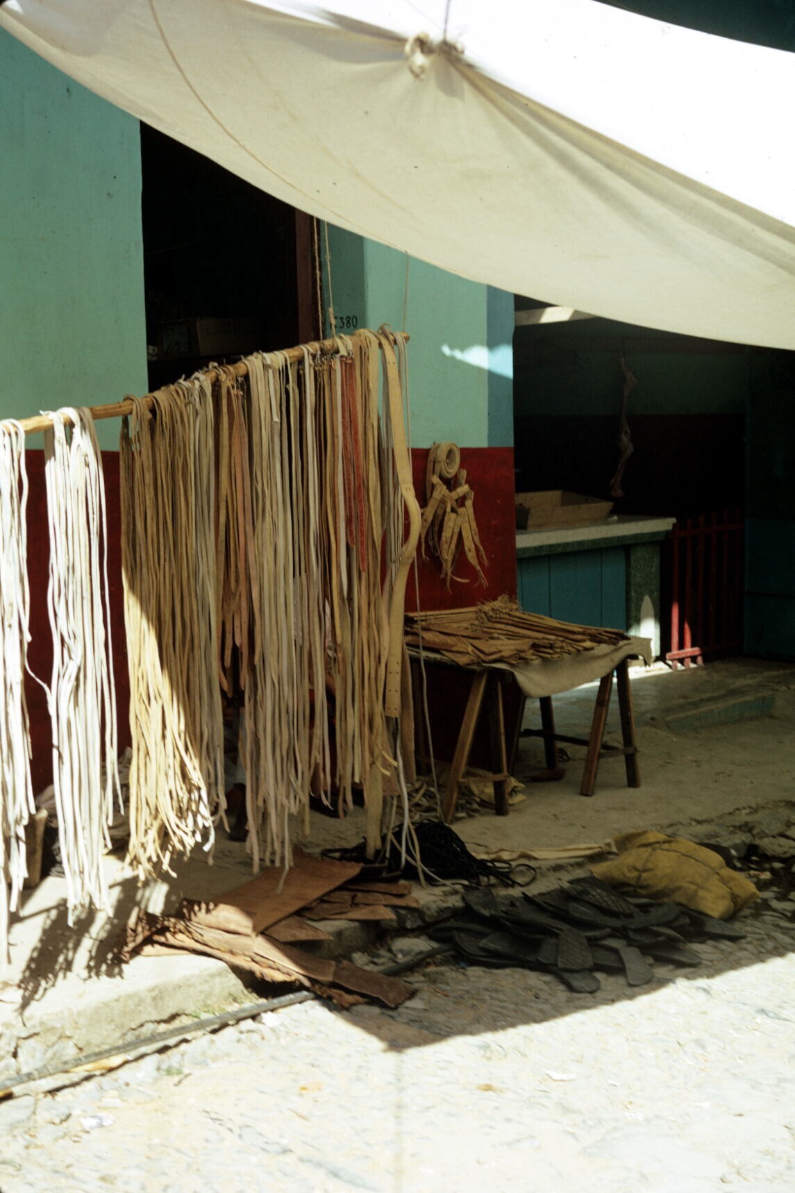 marktkraam met riemen en sandalen