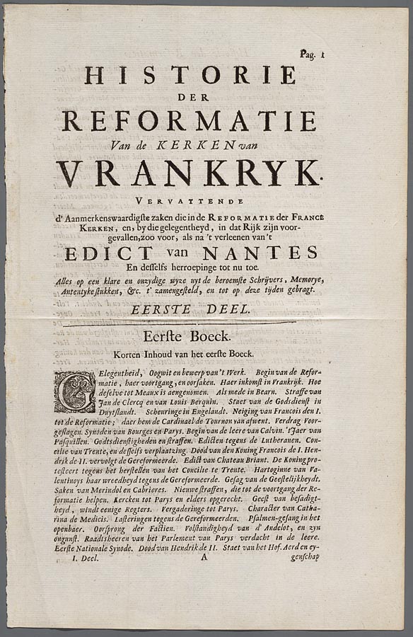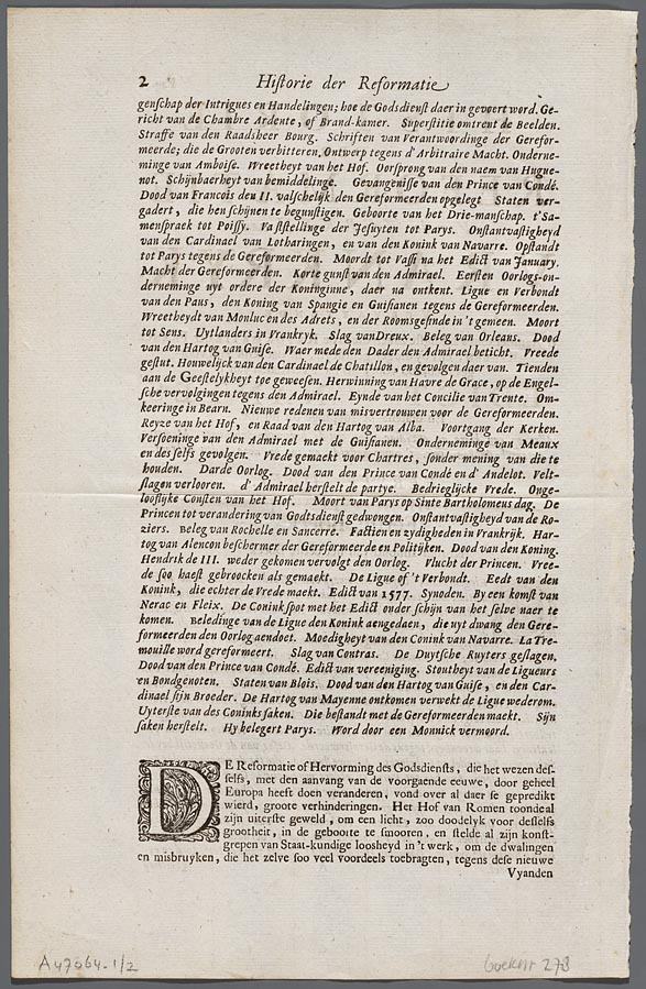 Blad met 2 tekstpagina´s uit "Historie der gereforme...