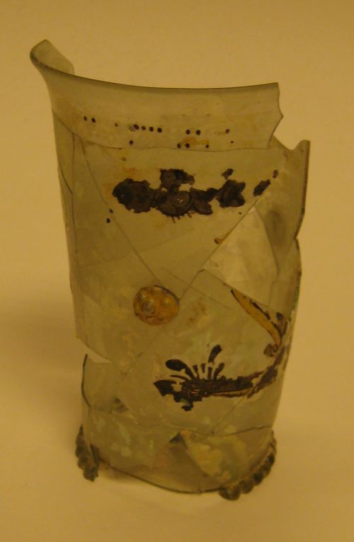 Restanten van een met email versierd drinkglas