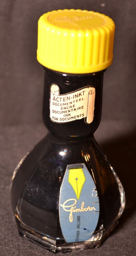 Inktflesje van glas gevuld met inkt van H. van Gimbo...