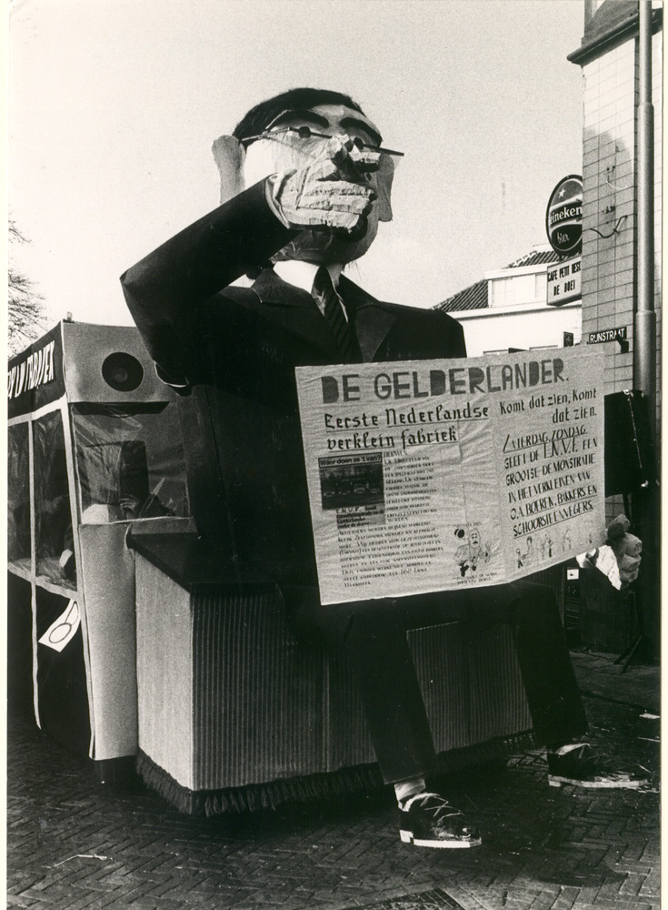 Zwart-wit foto van een wagen in de carnavalsoptocht ...