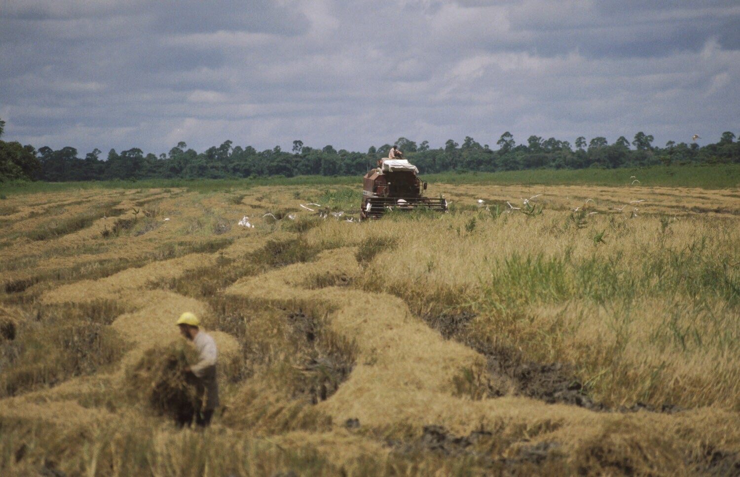Ten westen van Paramaribo; rijstoogst; op de achterg...