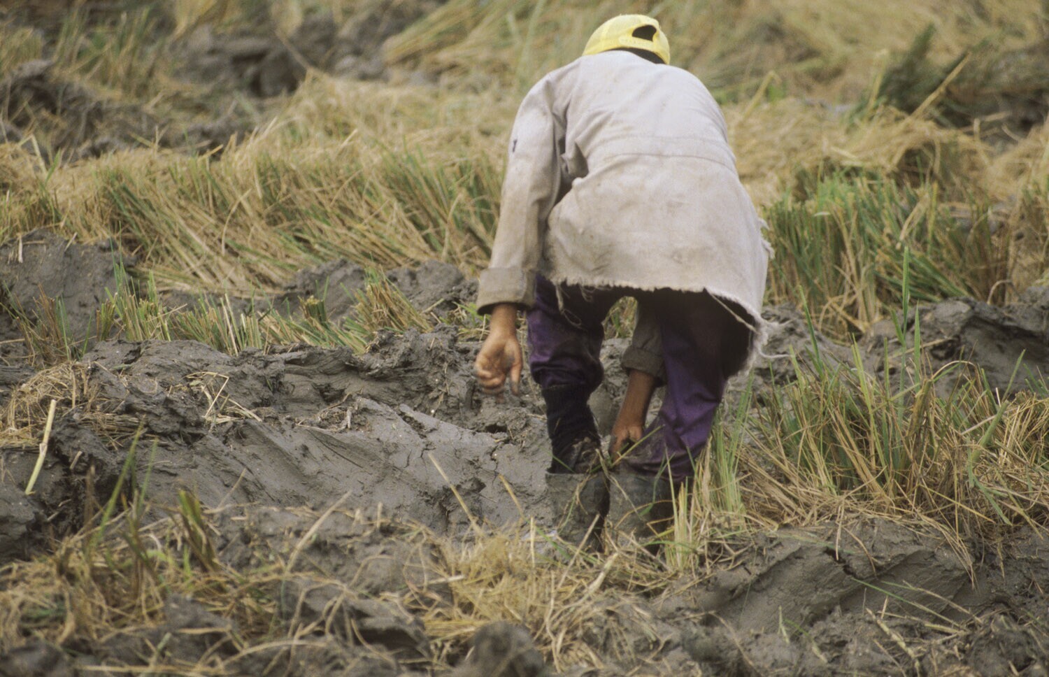 Ten westen van Paramaribo; rijstoogst; man met afval...