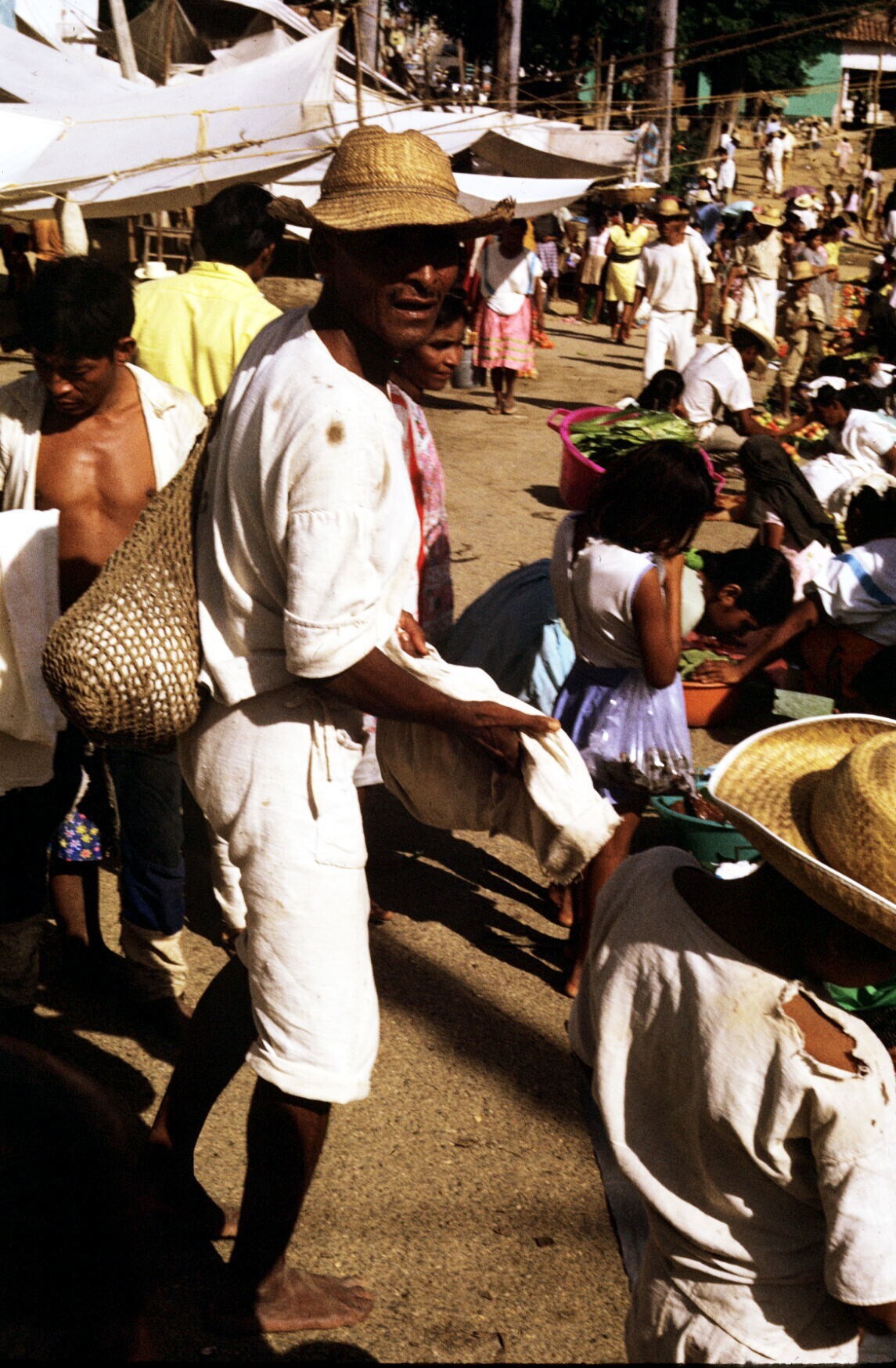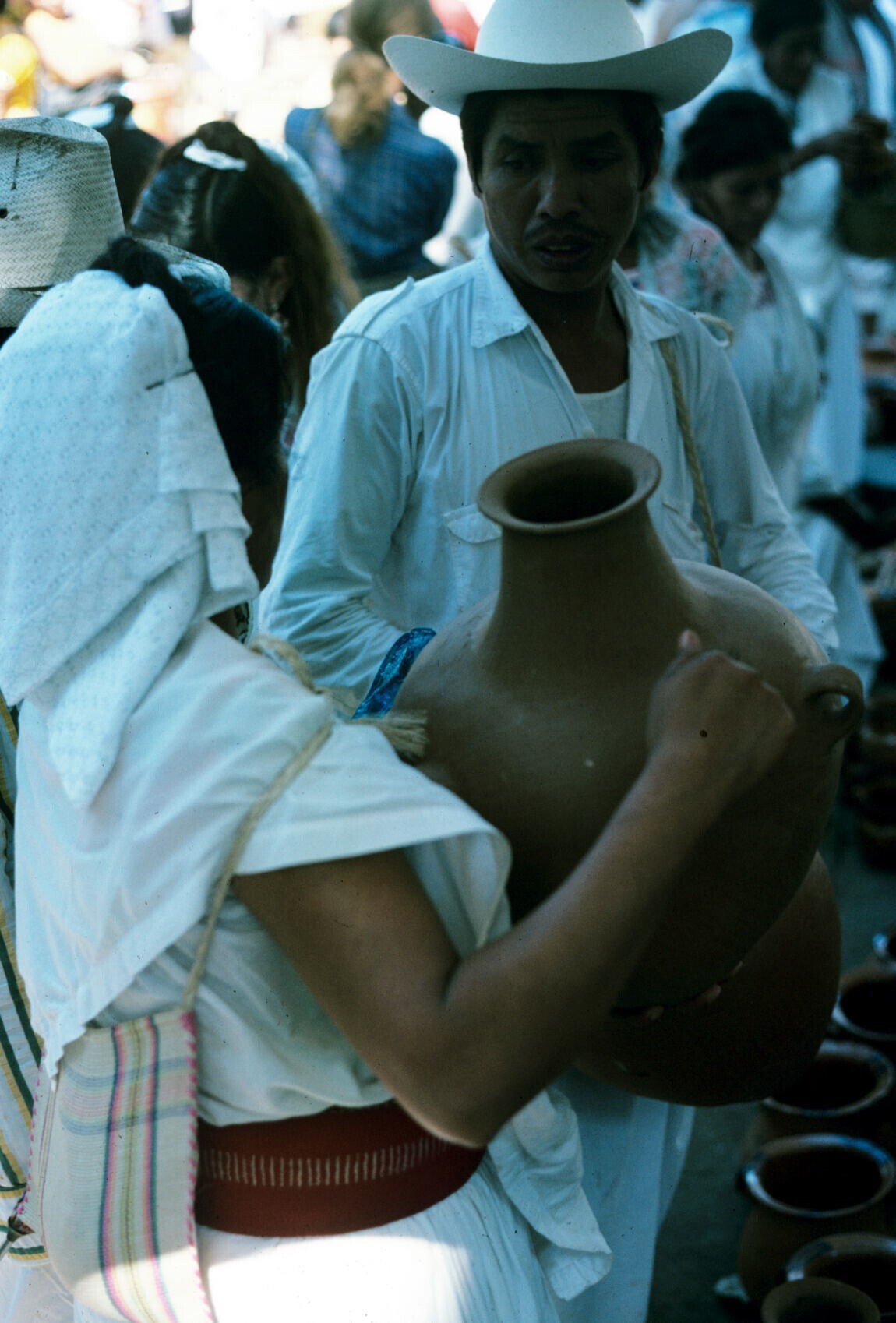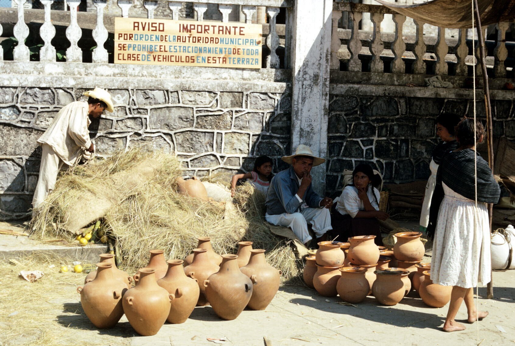 mannen in traje indio op markt; op voorgrond: aardewerk