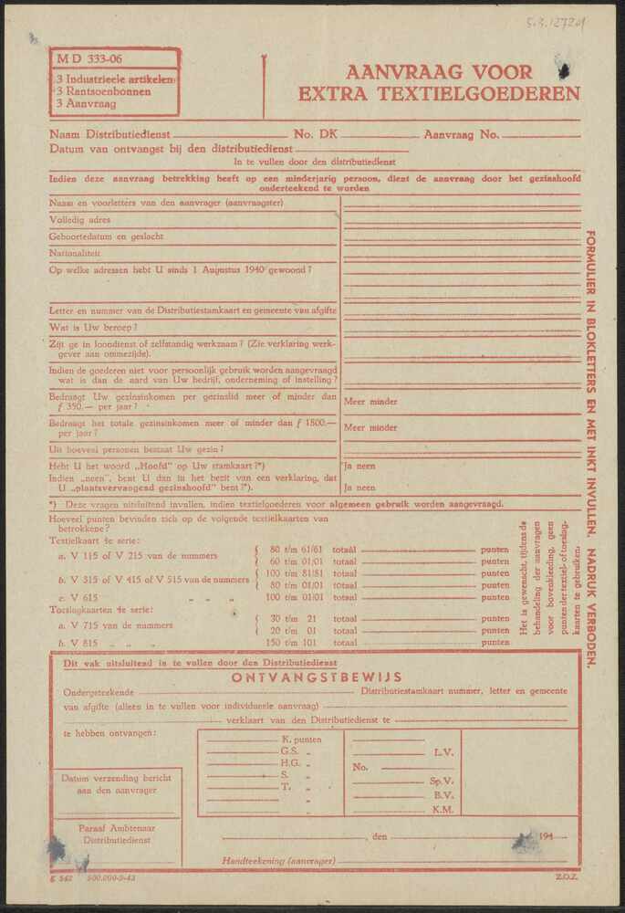 Formulier "Aanvraag voor extra textielgoederen", nie...