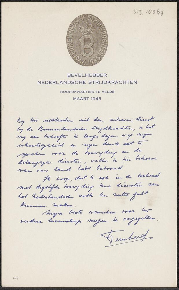 Bedankbrief van Prins Bernhard aan ontslagen leden B...