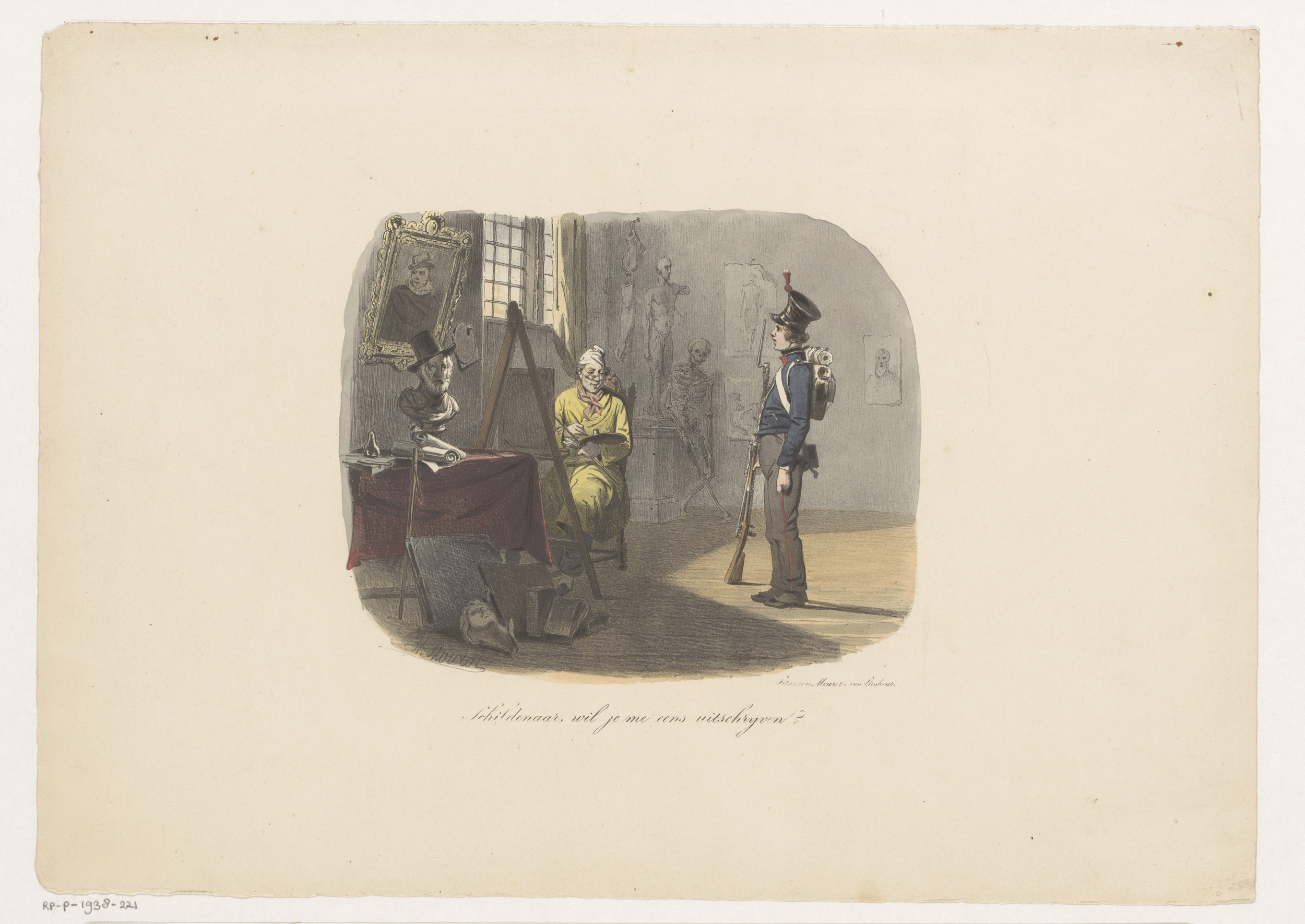 Soldaat staat model voor schilder in zijn atelier