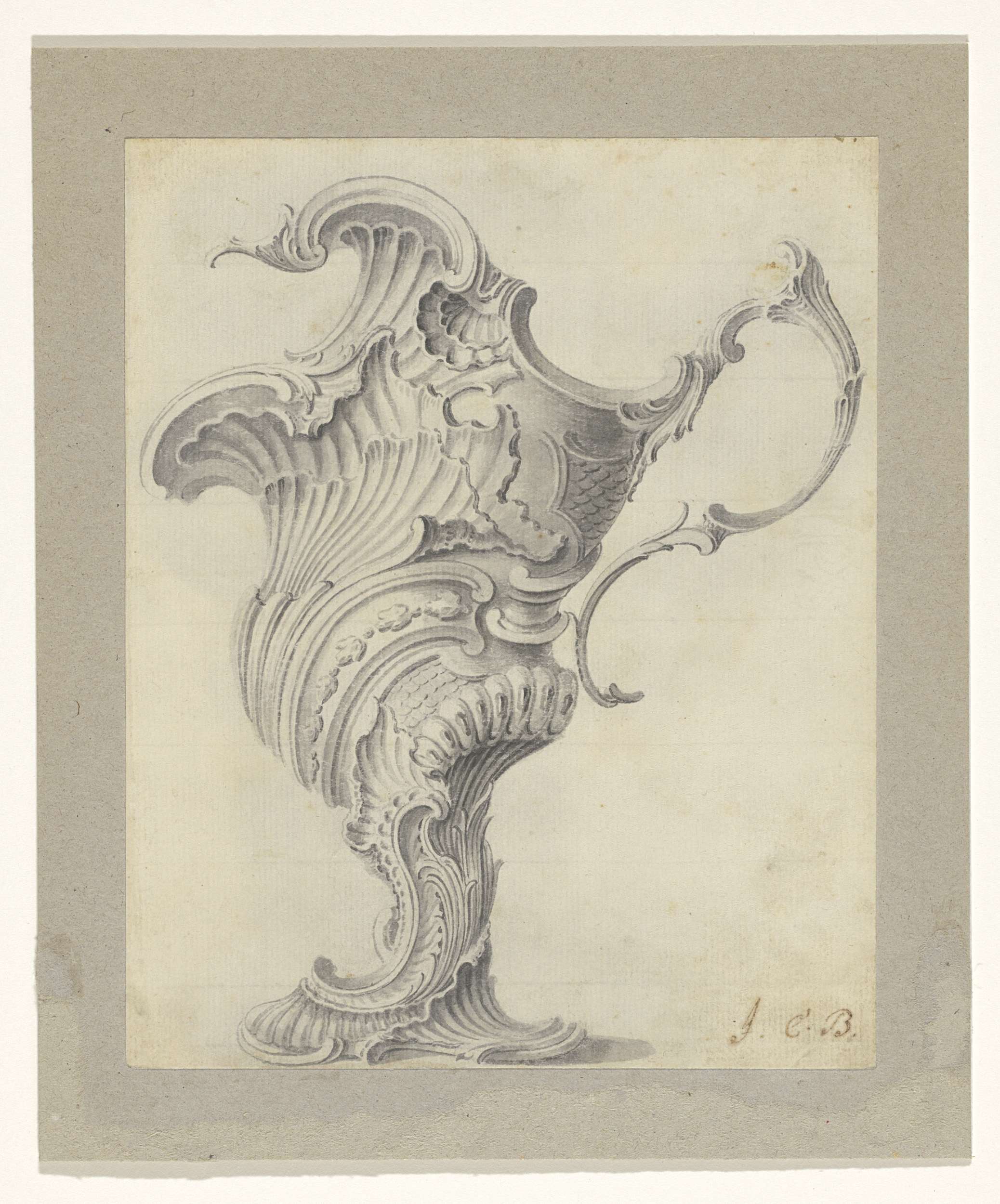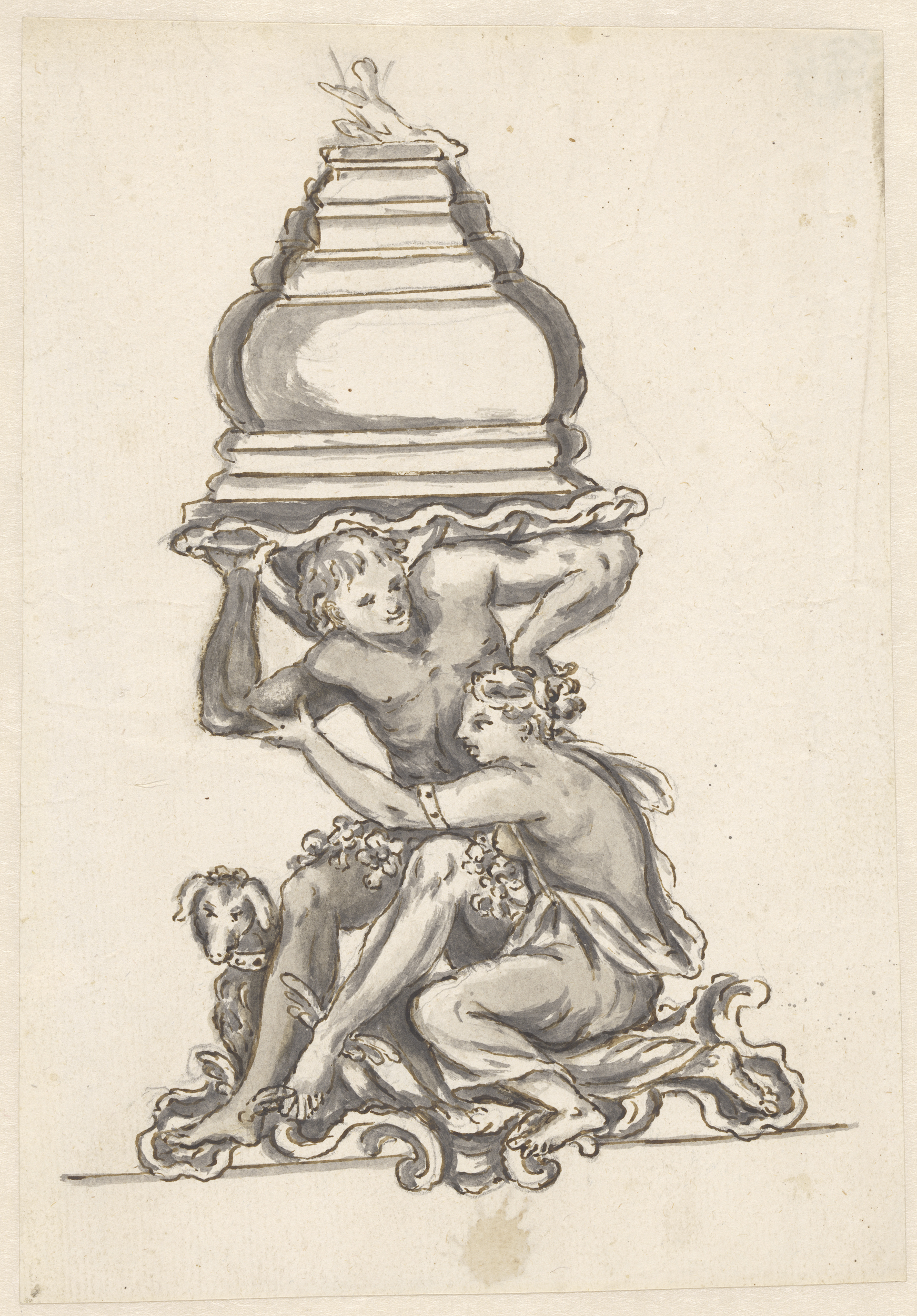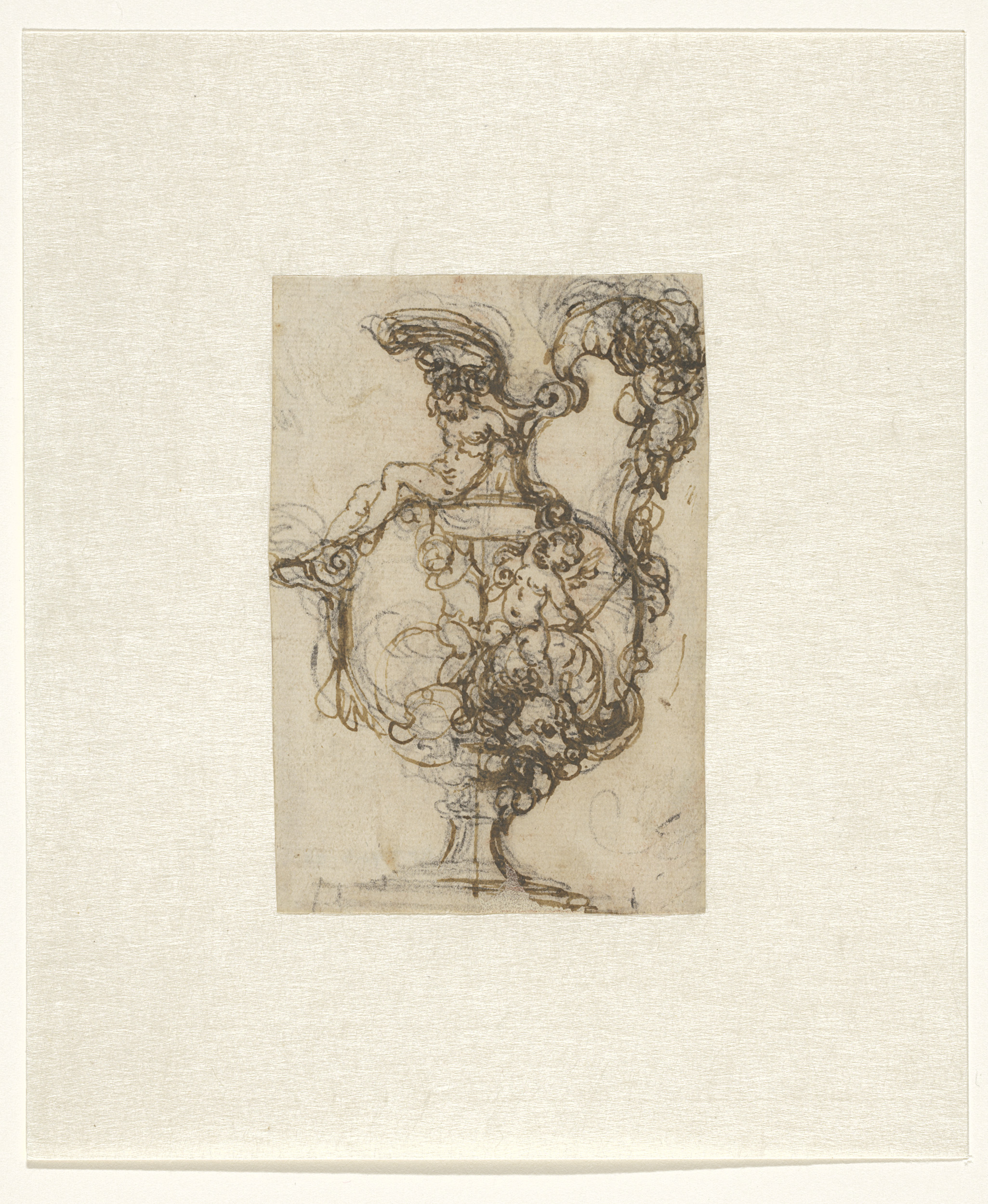 Ontwerp voor een kan met onder de tuit een naakte li...