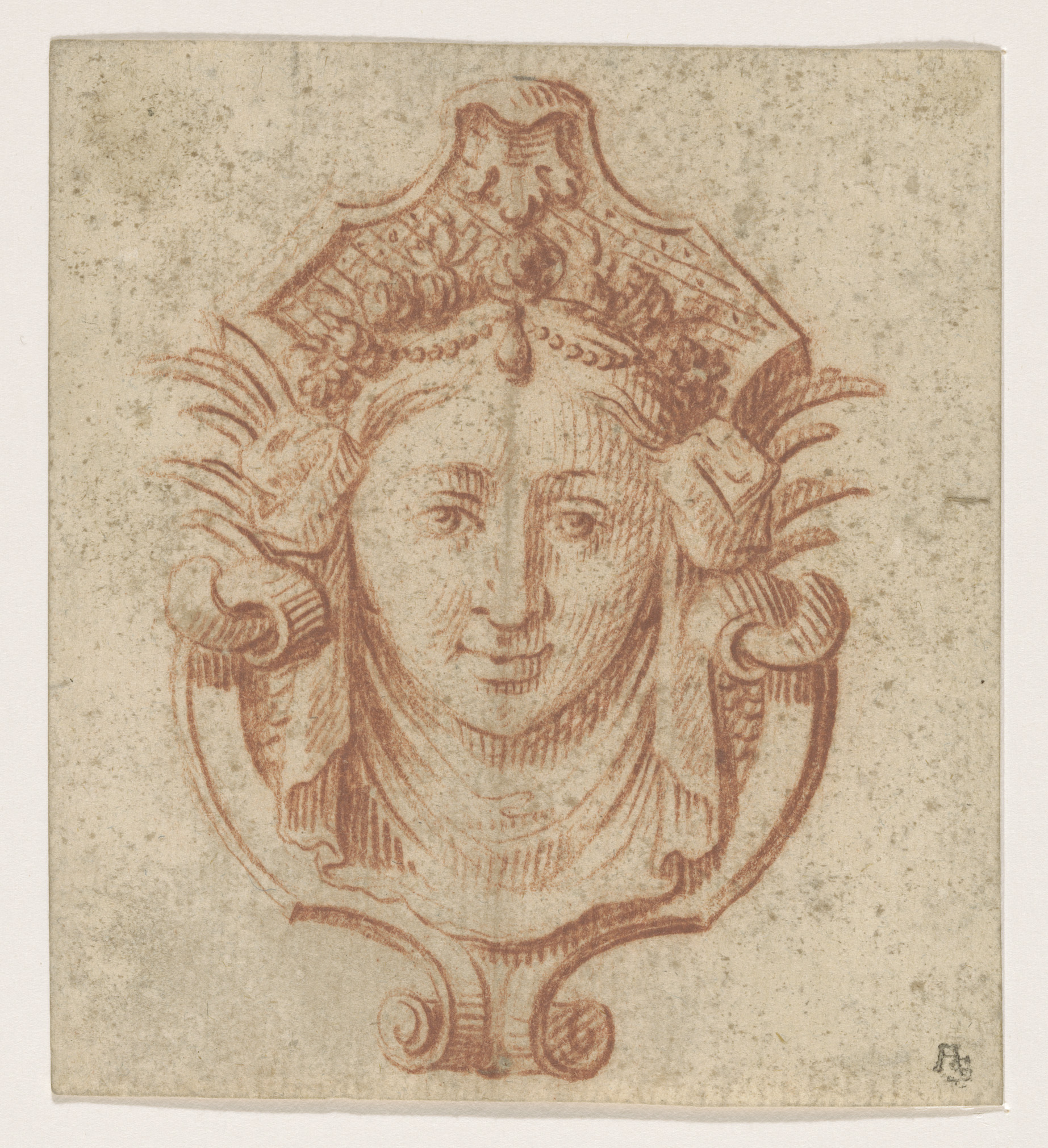 Schild van rolwerk met een vrouwenhoofd boven een dr...