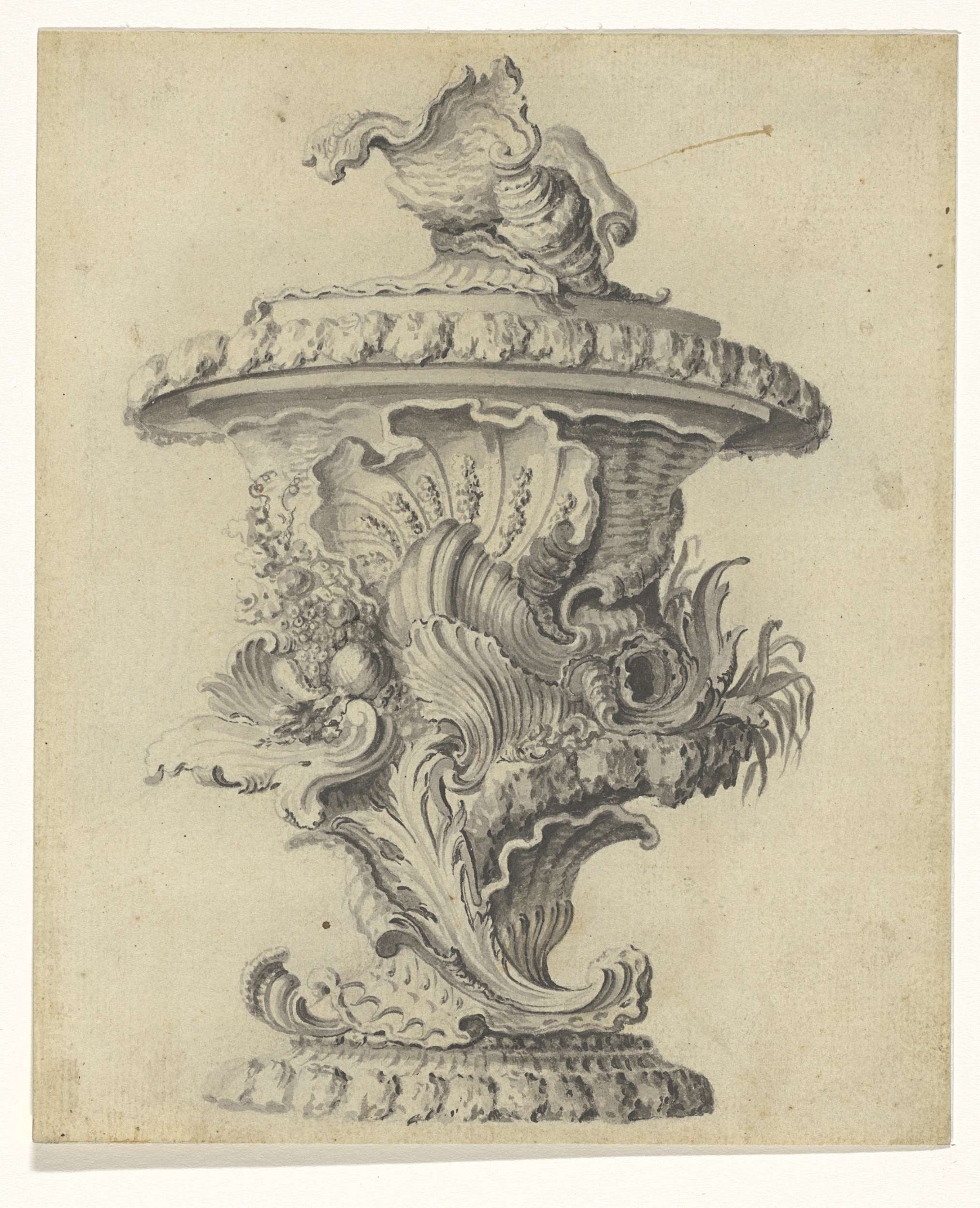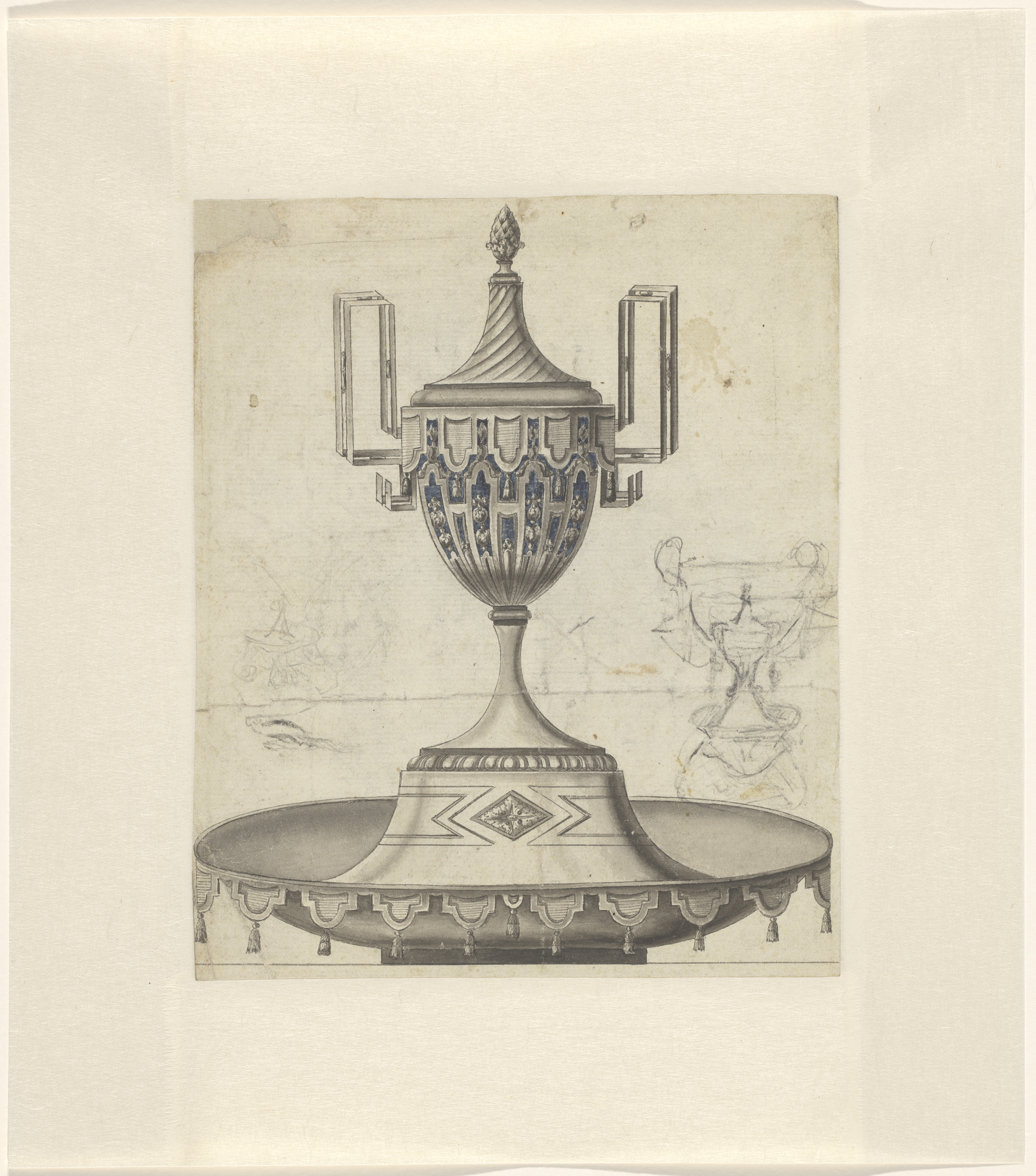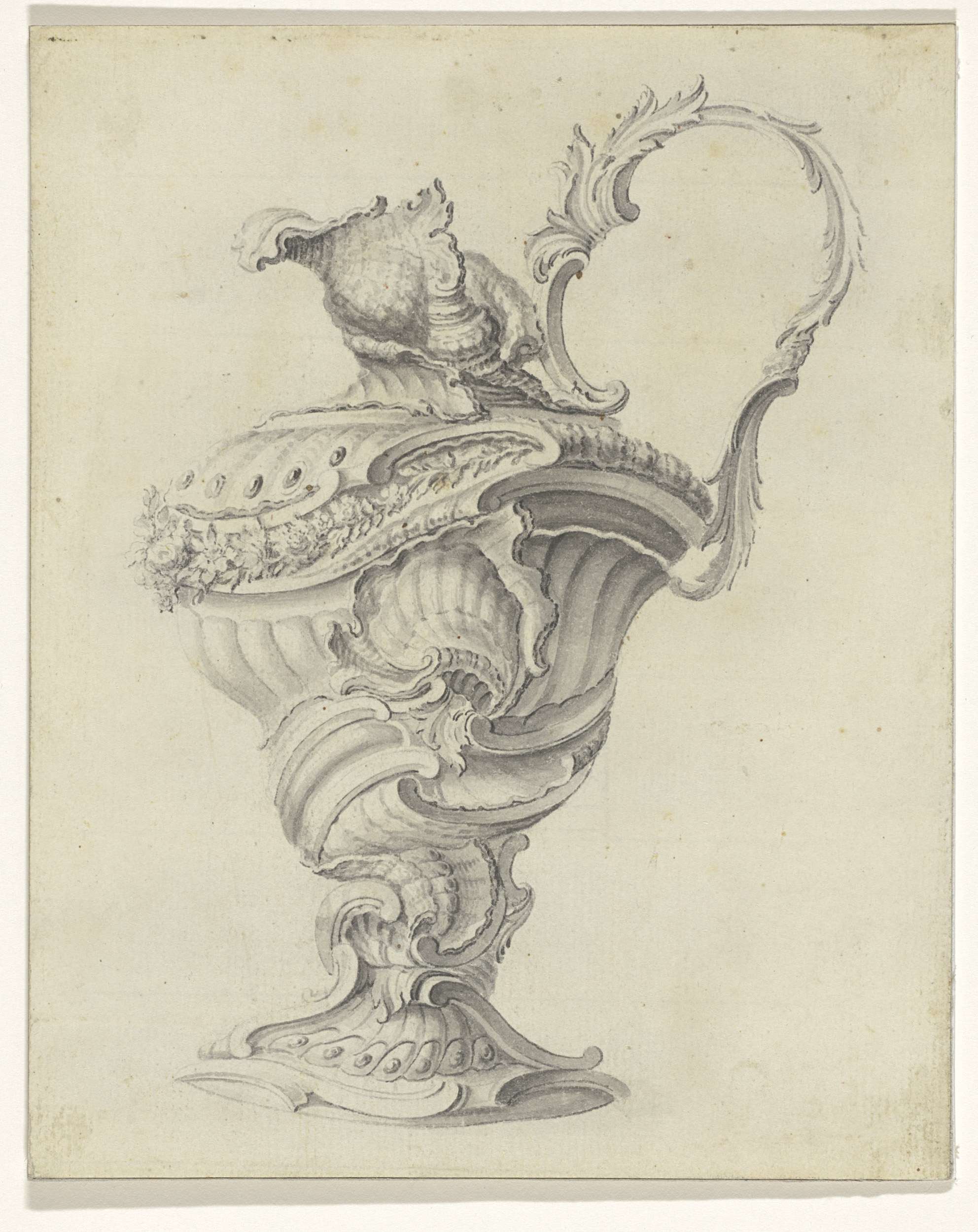 Ontwerp voor een kan met een deksel bekroond door Fama