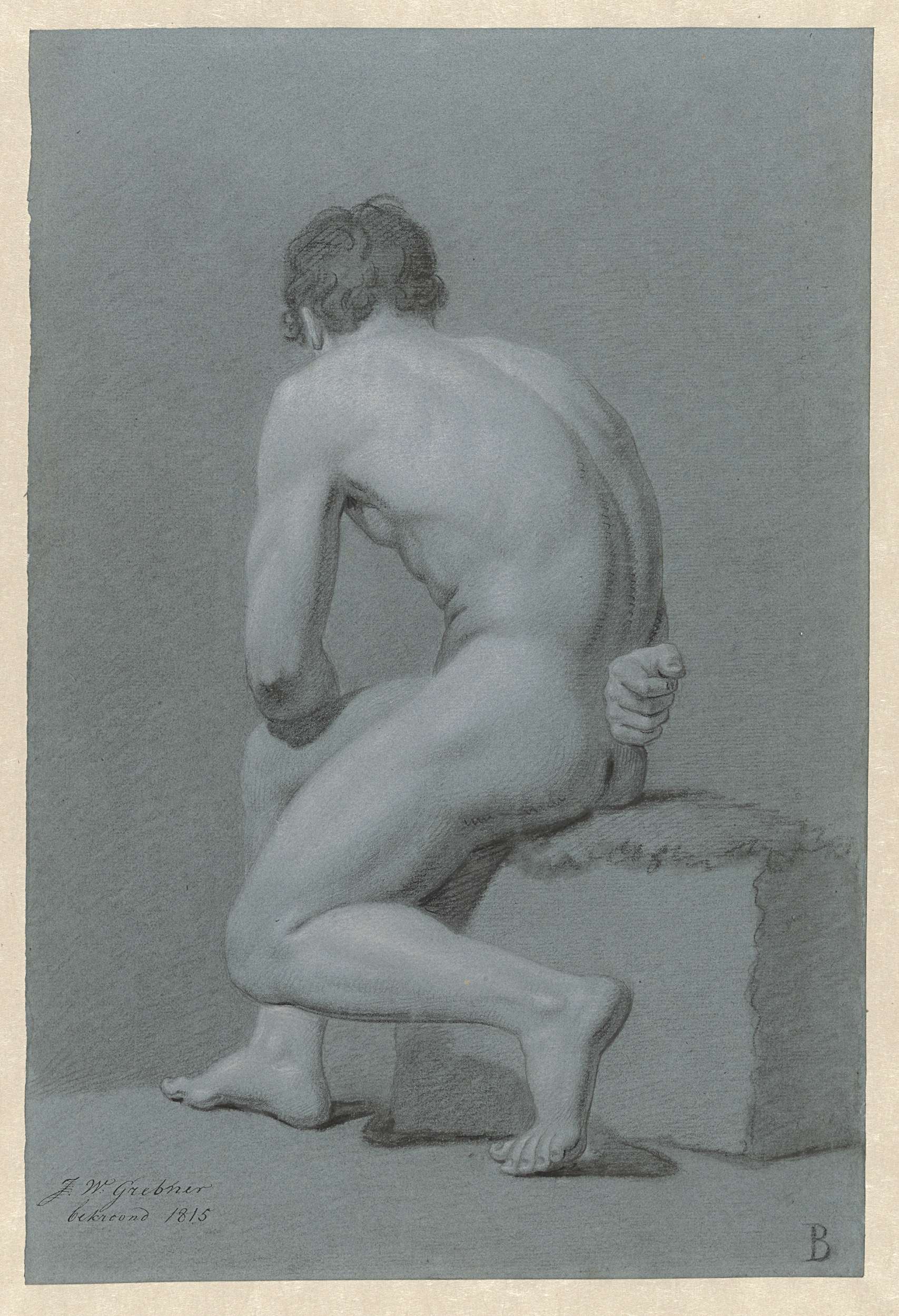Zittend mannelijk naakt, op de rug gezien